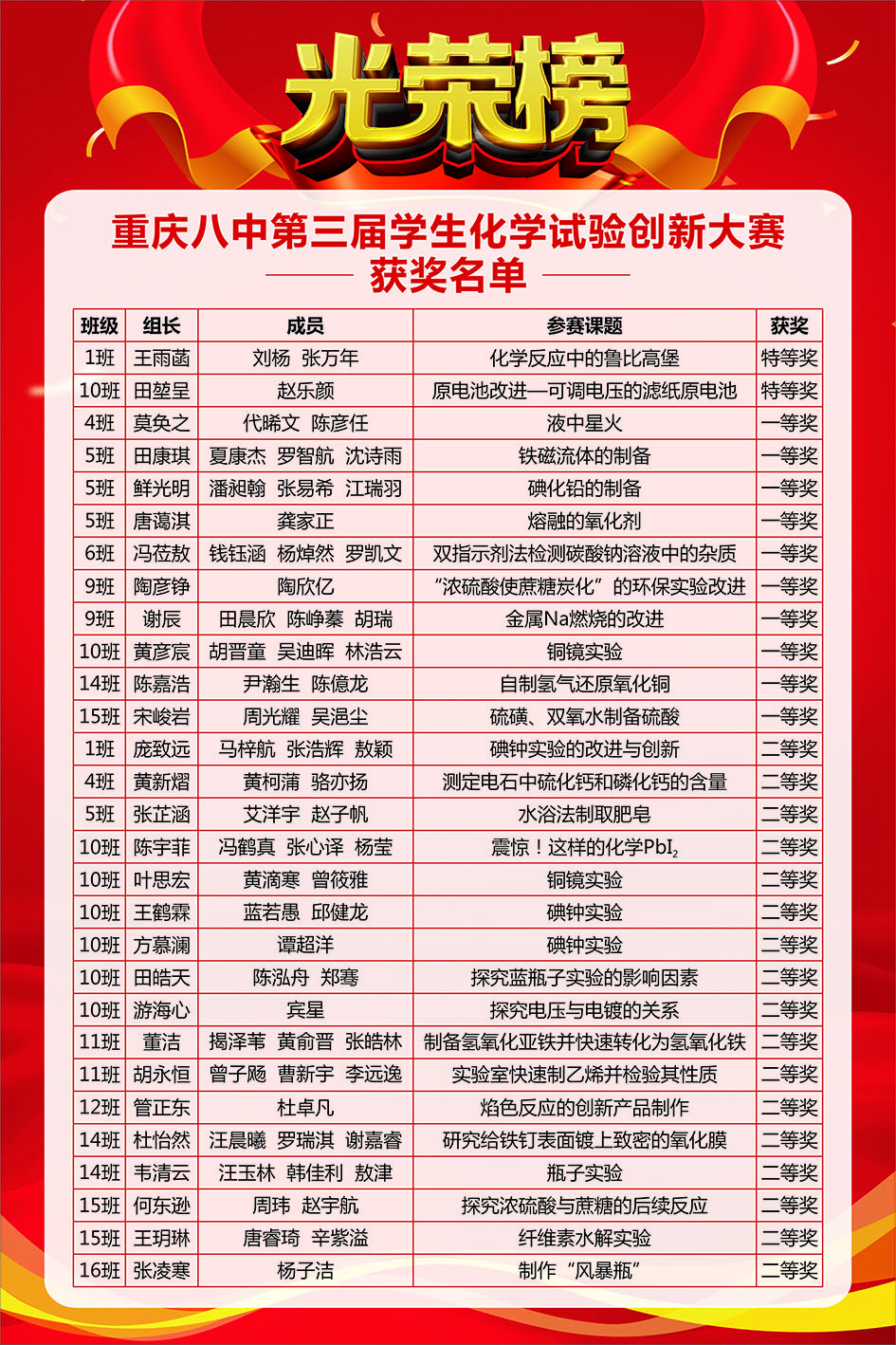 你想提升自己的实验技能吗?你想亲手做出网上流传的神奇实验现象吗?你想自己设计的实验成为老师们届届相传的演示实验吗?你想你的名字载入八中化学史册吗?这些在化学实验创新大赛中通通都能实现!