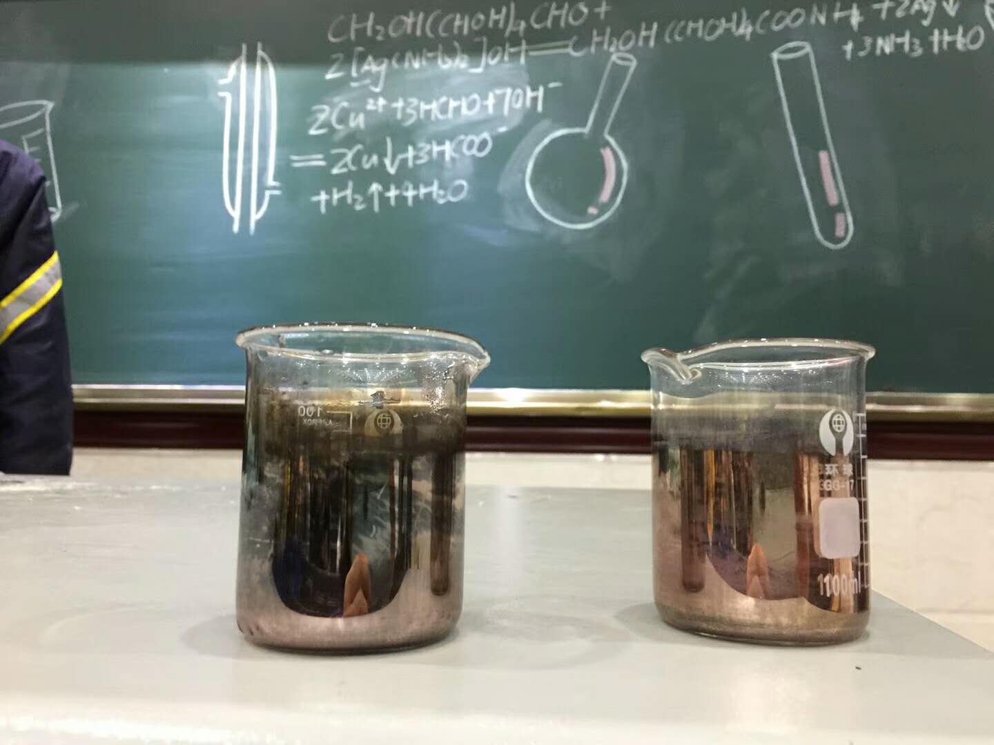 有机化学中光亮的银镜让同学们兴致盎然,可是,古代不是先有铜镜的吗?银镜、铜镜,都能制备吗?10班同学们通过查阅资料,从银镜原理出发,设计实验,制备铜镜!铜镜不易在小烧杯中附着,还得结合银镜原理,先制备银镜才能附着光亮的铜镜。先有银,后有铜!不仅知识可以由此拓展,原来实验也是由此拓展!相互合作制备铜镜,你中有我我中有你分不清!