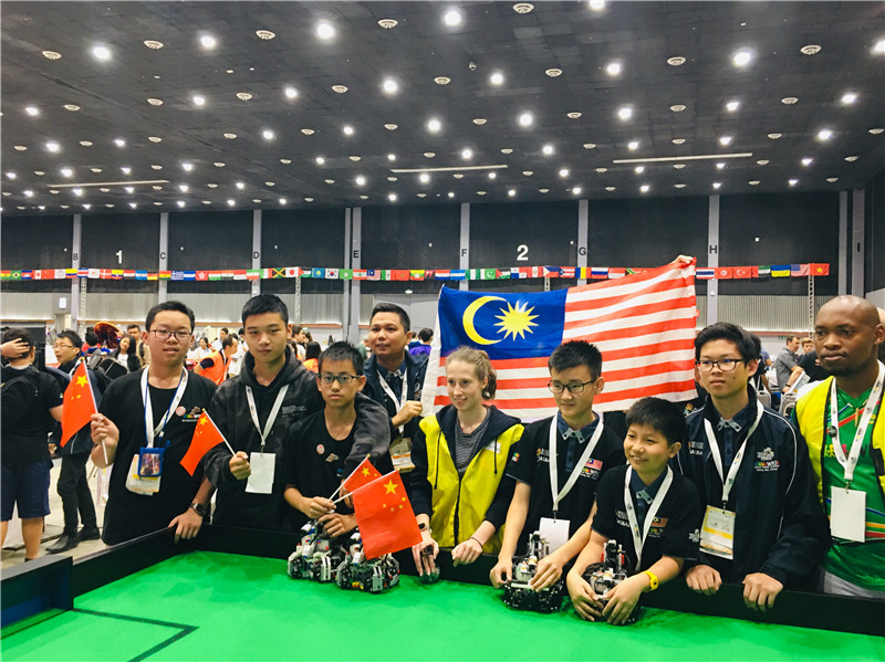 为了参加本次国际邀请赛,同学们和指导老师准备了为期2个月,修改了10多次机器人结构和程序。同学们在比赛期间不断学习,随机应变,甚至与其他队伍交流到晚上1点半,在赛场上展现出极高的综合能力。最终,刘瀚文同学代表中国队在全场高举国旗,得到了大家的一致赞许!
