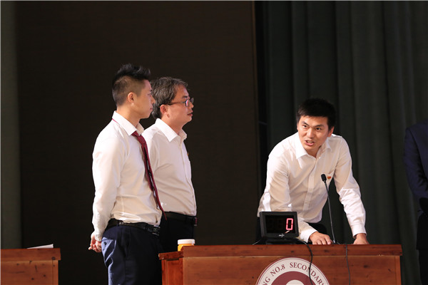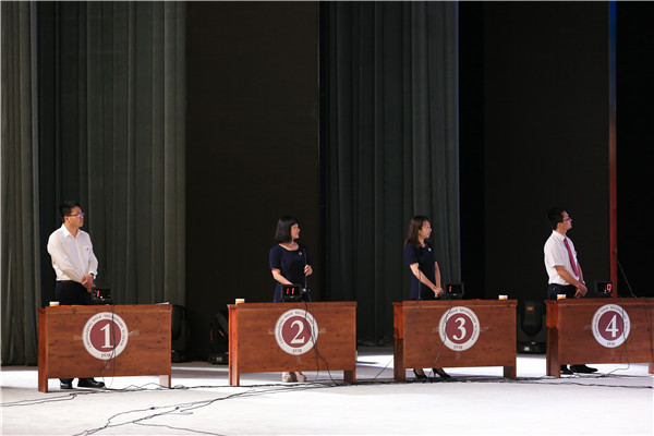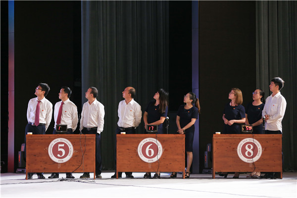 庆祝大会在《没有共产党就没有新中国》的歌声中拉开序幕。随后备受瞩目的“党性知识竞赛”正式开始,竞赛试题内容涉及习近平总书记十九大报告原文、习近平总书记两会期间参加重庆代表团审议的重要讲话和重庆八中80周年校庆历史知识回顾,共分成“单兵直击”“激流勇进”“心有灵犀”“铁肩担当”“集团作战”五个部分。本次比赛分支部组成9支参赛队伍,并采用电脑随机从全体党员中抽签的方式确定参赛队员。本次知识竞赛以我校党委一年来开展的一系列政治学习为基础,引起全校党员广泛参与,尤其是“心有灵犀”环节,更是激发了全体党员的参与热情,掀起竞赛的高潮。