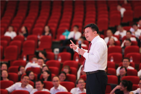 重庆八中校长、党委副书记周迎春发表《勇挑重担,砥砺前行,争做幸福的八中人》的讲话。周校长以《厉害了,我的国》这部电影所反映的新中国建设伟大成就,表达了身为一名中国共产党党员的荣誉感和自豪感,他说祖国的日益强大充分印证了习近平总书记“幸福都是奋斗出来的”这一金句。周校长对我校在党委的领导下,过去一年所取得的各项教育教学成绩做出充分肯定,感谢全体党员的辛勤付出,周校长强调:八中人、尤其是八中的党员同志们,都在用实际行动诠释着“幸福都是奋斗出来的”这一真谛。最后,周校长代表学校党委向全校党员同志提出几点希望:希望党员同志们进一步提高“党性修养”,做八中立德树人的先行者;希望党员同志们进一步提升“四有”水准,做八中教育的奋进者;希望党员同志们进一步承继“八中精神”,做八中大发展的铺路者;希望党员同志们进一步助推学生成长,做八中“梦之队”的筑梦者。
