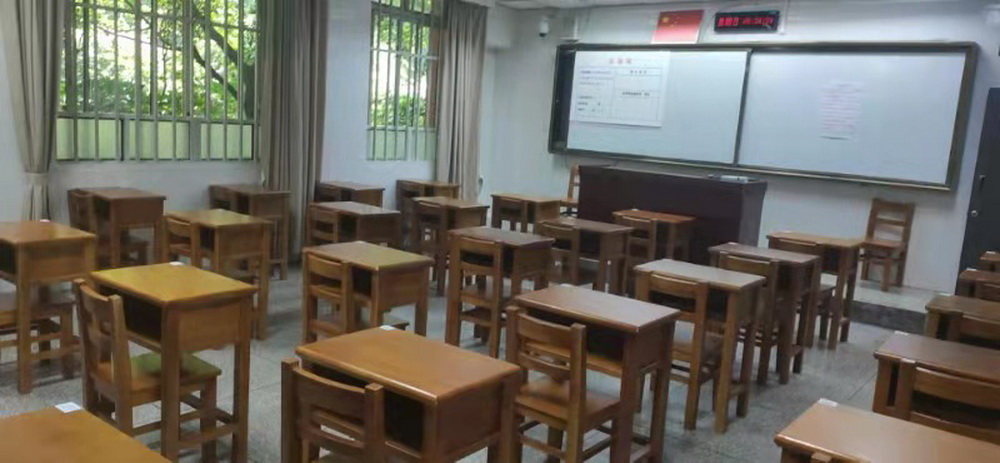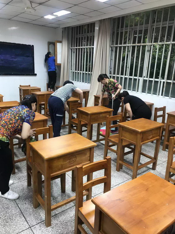 即将迎来一年一度的高考,后勤人员在部门领导带领下对学校各考场考室进行布置,调整考室桌椅粘贴坐位号等,并全面检查、维修、更换线路、空调、灯具、吊扇等消除各种隐患。