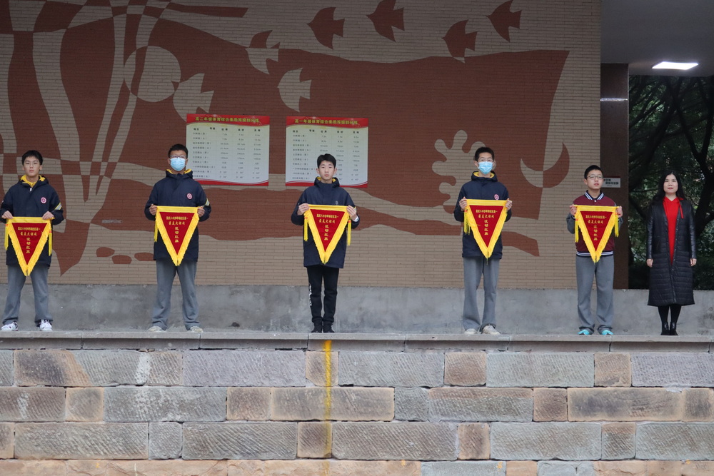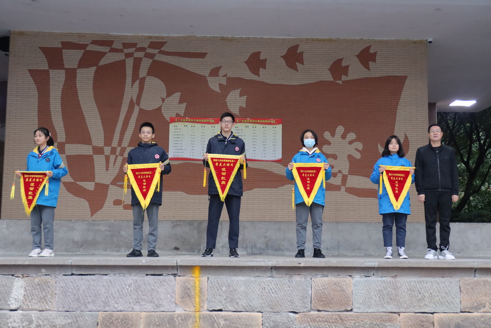 朝会最后,党委副书记王怒涛老师为获得“最美大课间”的高2023级17班、20班、23班、25班、27班授锦旗,副校长付英老师亦为高2024级14班、15班、19班、22班、24班授此荣誉锦旗。