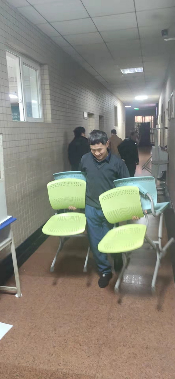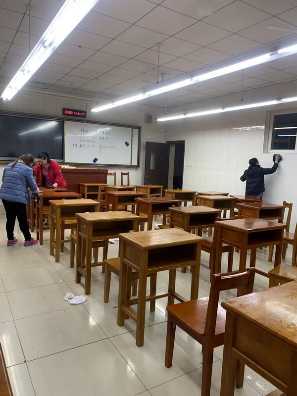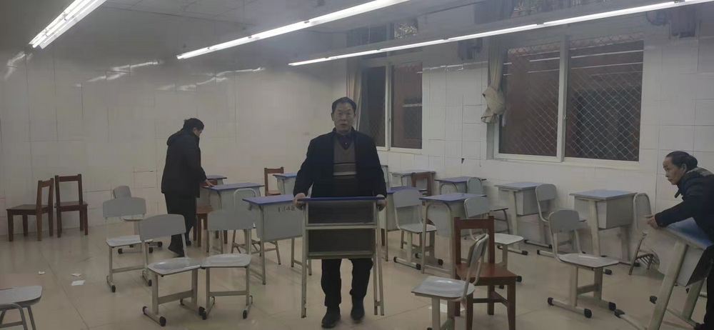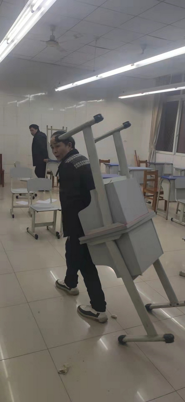 在2022年1月15日,八中高二年级同学迎来普通高中学业水平合格性考试,同学们将精神饱满,勇敢的去迎接挑战!而总务处后勤人员也争分夺秒的迎接属于他们的“战斗”,在1月13日结束了一天的忙碌工作,傍晚大家来到教室开始准备学业水平所需要的考场布置,分工细化,调整布置桌椅、清理打扫考室、粘贴考号等,为高中学业水平合格性考试能迎来好的收获付出一份微薄之力!