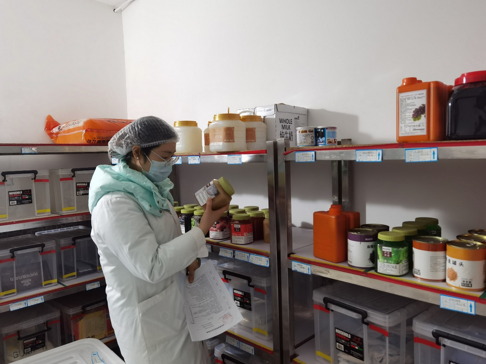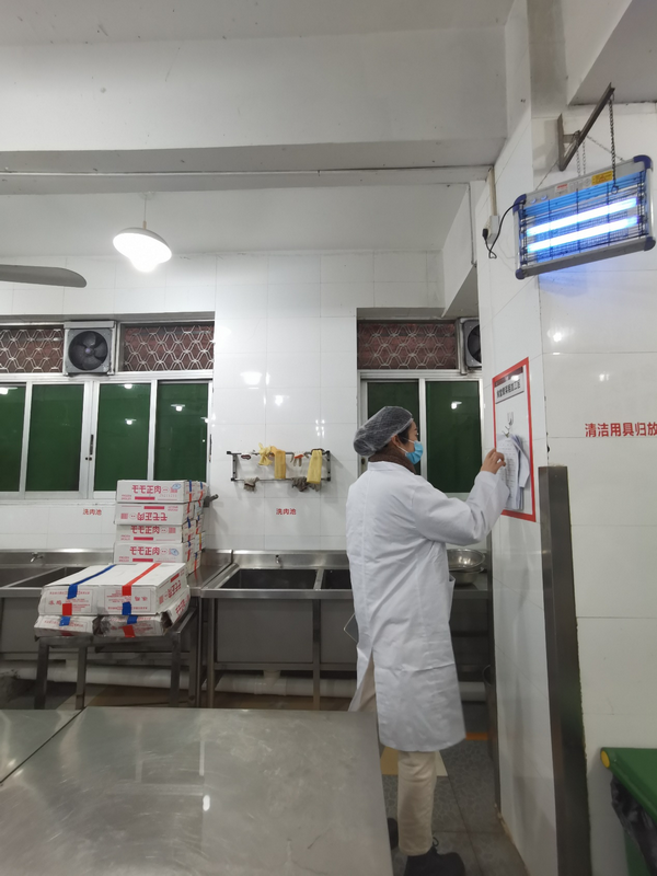 任萍老师根据我校食堂食品安全自查表对食堂遵守许可情况、从业人员管理、环境卫生管理、设施设备管理、原辅材料管理、食品库房管理、食品加工制作管理、餐具清洗消毒管理及其它事项管理等九大项目逐项进行了全面、细致地检查。未发现安全隐患,整体情况较好。对灭蝇灯未及时清理等少数细节不到位的地方提出了整改,强调要不断细化管理措施,定期排查,有效防范和避免食堂食品安全事故的发生,确保师生饮食安全。