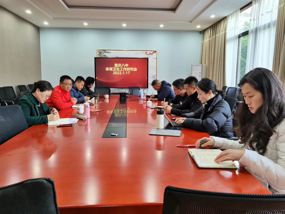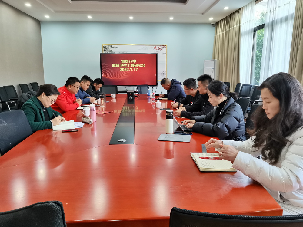 2022年1月17日,重庆八中体育卫生工作研究总结会在沙坪坝校区举行,本次工作研究会对“各校区体育教学工作、团队建设的发展方向、排球课程基地的持续推进、卫生板块工作的开展”进行了深度的交流和讨论,重庆八中纪委书记唐晓娥、重庆八中体卫处主任梁柱、重庆八中行政办公室副主任朱艳、重庆八中学生处副主任吕舟以及各校区负责人和部分备课组长参与会议。