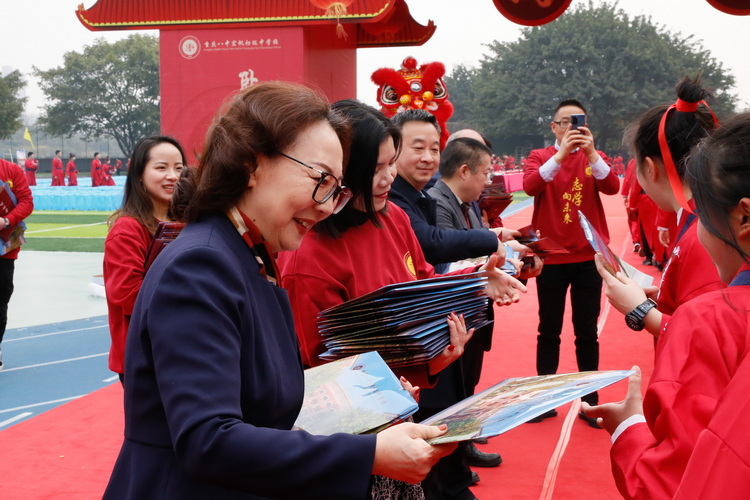 第三个篇章“圆志于学,奔向未来”,重庆八中宏帆中学校长郝永宁铿锵有力的演讲《最是一年春好处,志学奋进正当时》感染了在座的每一个人。她寄语同学们立志创造属于自己的奋斗奇迹,立志拥有独立的思想和高贵的人格,向阳生长,志学奋斗,青春无悔。在见证一百天的重要日子里,重庆八中校长周迎春和党委书记卿知人书记为宏帆初2022级揭“志学”牌,年级主任黄江林和支部书记赵宇红接牌。揭牌后,12班赵萱懿同学带领同学们喊出十五岁的誓言。“三载峥嵘,一心学海遨游;今朝圆梦,无悔书山攀登。”全体学生铮铮的誓言响彻云霄。醒狮队的表演让整个活动又进入了一个小高潮。“旗开得胜,金榜题名;蟾宫折桂,前程似锦。”表达了全体教师对同学们的美好祝愿。最后,在祝炯、姚浪和28班彭森科、24班姜力畅 、16班陈思含、31 余彦辰几位同学的领唱,全体同学的大合唱《骄傲的少年》中,这次活动到达了最高潮。