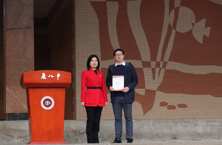 朝会最后,重庆八中副校长付英老师为熊翼老师颁发重庆八中“朝会大讲堂·荣誉讲师”证书。