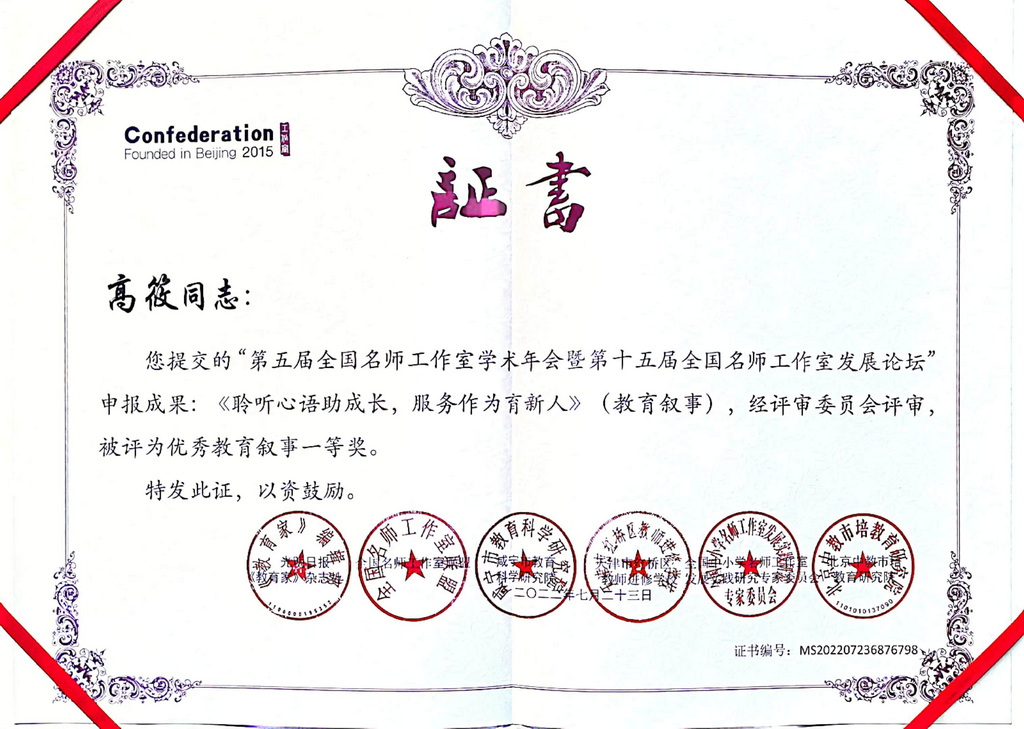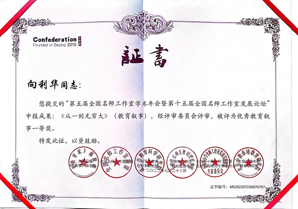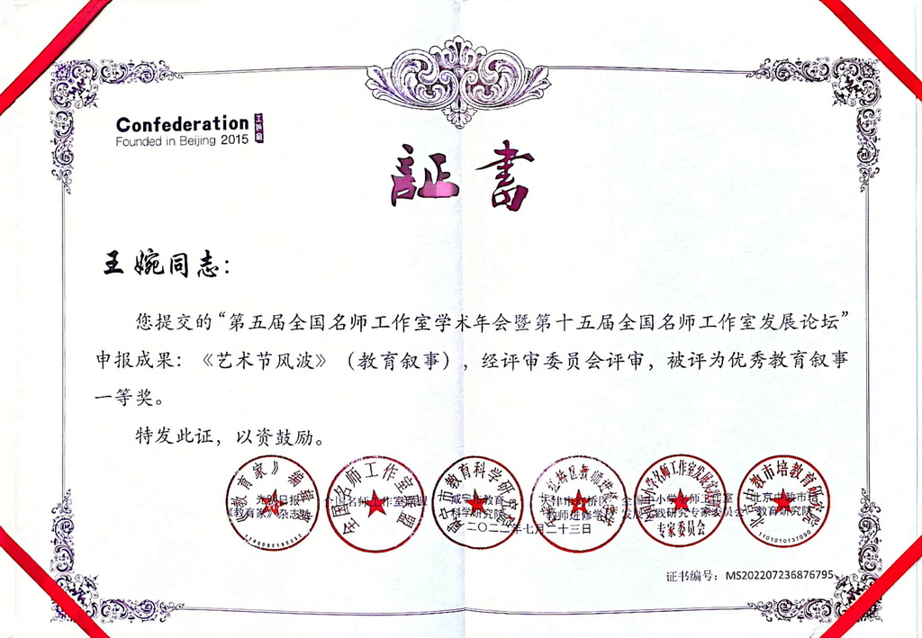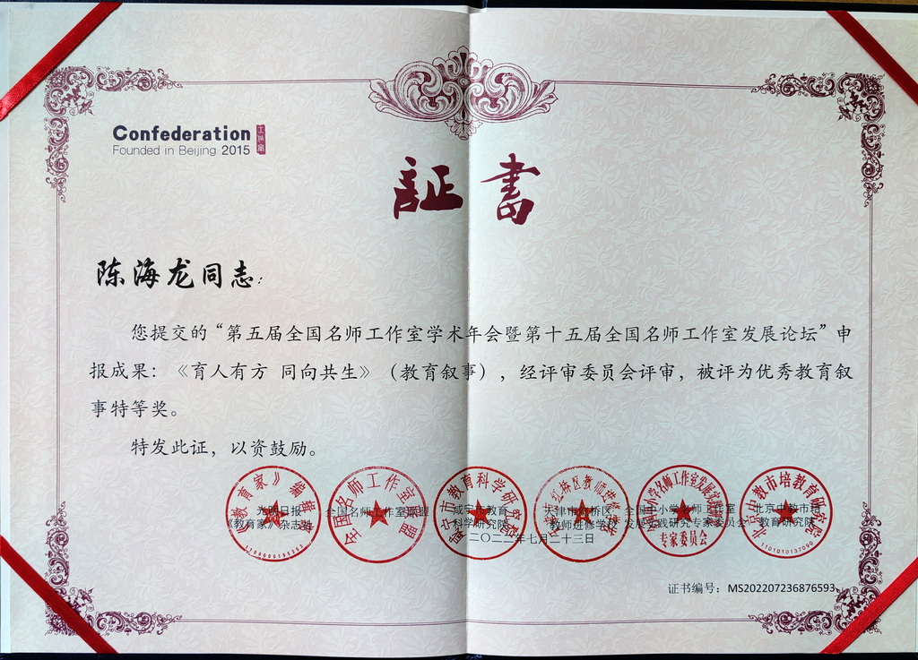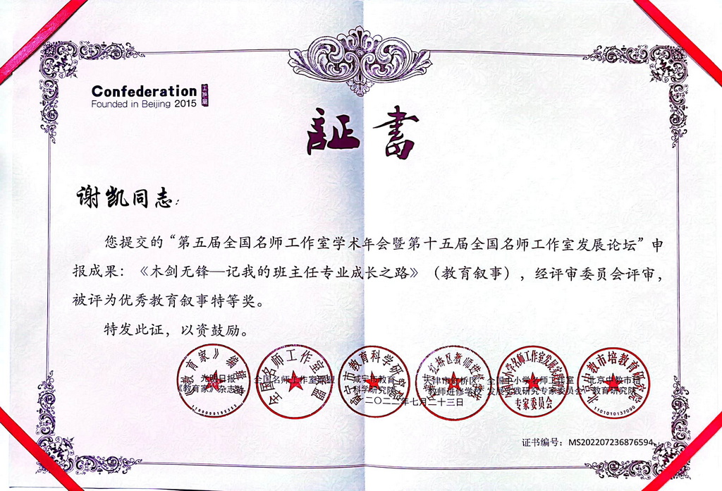 在刚刚结束的“第五届全国名师工作室学术年会暨第十五届全国名师工作室发展论坛”申报成果评比中,重庆市教育学会、新利体育登录入口官网 汪正才名班主任工作室再获全国大奖,其中陈海龙、谢凯两位老师获教育叙事评比特等奖,汪正才、鄢斌、向利华、王婉、高筱五位老师荣获一等奖。这是汪正才名班主任工作室又一次在全国班主任专业比赛中的一次集体出彩。
