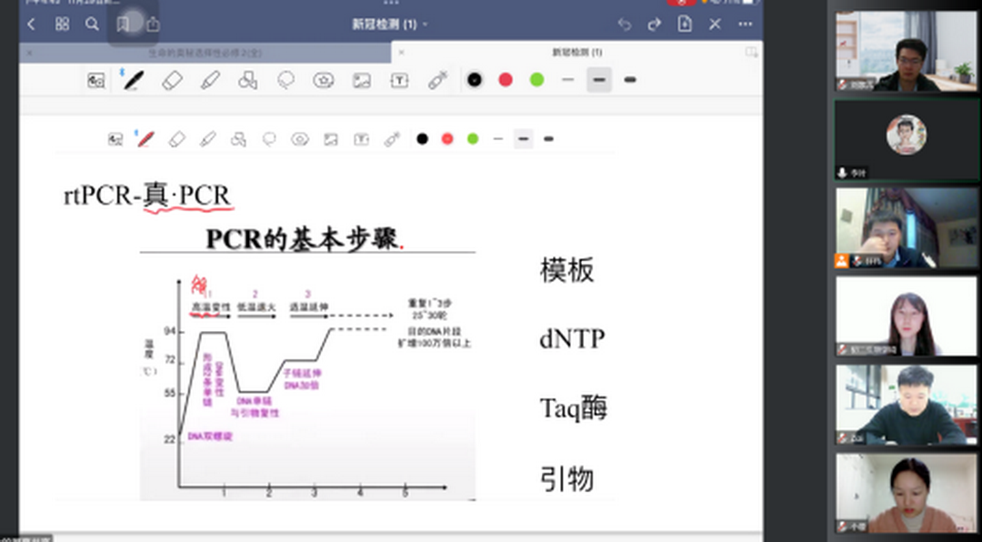 本次教研活动主要有三个环节:首先,由向贞老师和郑思彦老师进行授课,并介绍教学内容的设计思路;其次,高一年级杨胜涛老师、初一年级郭琦老师作为主评就教学内容和线上教学模式进行评课;最后,高二年级李叶老师作主题为“新冠检测”的微专题。