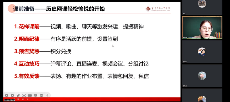 活动的第二项环节是李杰敏老师微讲座。李杰敏老师讲座的题目题《网课期间如何活跃历史课堂》,她从“导言、课前、课中、课后”四个部分分享了自己的思考。她认为历史课应该讲究大格局和精细化,课前应该是轻松愉悦的开始,课中应该尤其重视“导入、课件、设问、语言”,课后应该加强反思与调整。李杰敏老师结合自身教学经历与多方学习的收获,列举了大量教学案例,引起与会老师共鸣。
