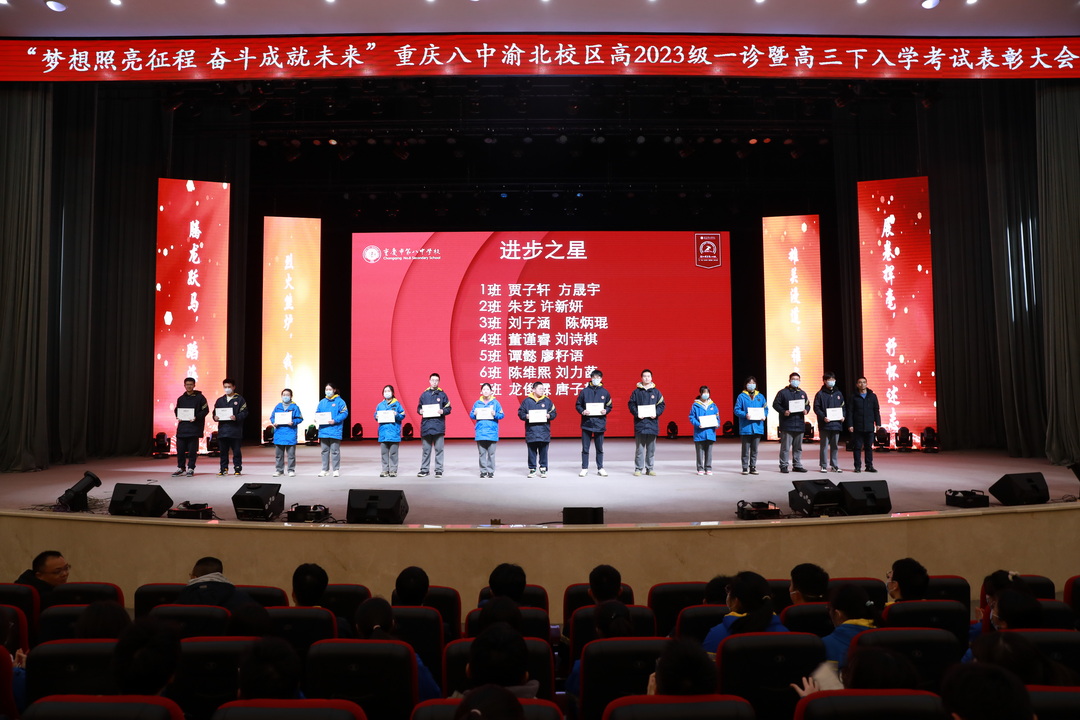 冲刺一诊,我们不甘平凡,誓作战士去拼搏,不负流年;迈向高考,我们不停追赶,勇攀高峰而昂首,践足烈焰,憧憬着繁星点点,脚踏着旅途蜿蜒。为表彰优秀、鼓励进步,激发高三学子高昂的学习热情,营造良好的学习氛围,2月1日晚,重庆八中渝北校区高2023级举办了“梦想照亮征程,奋斗成就未来”为主题的一诊暨高三入学考试表彰大会,重庆八中渝北校区高2023级全体师生参加此次大会。