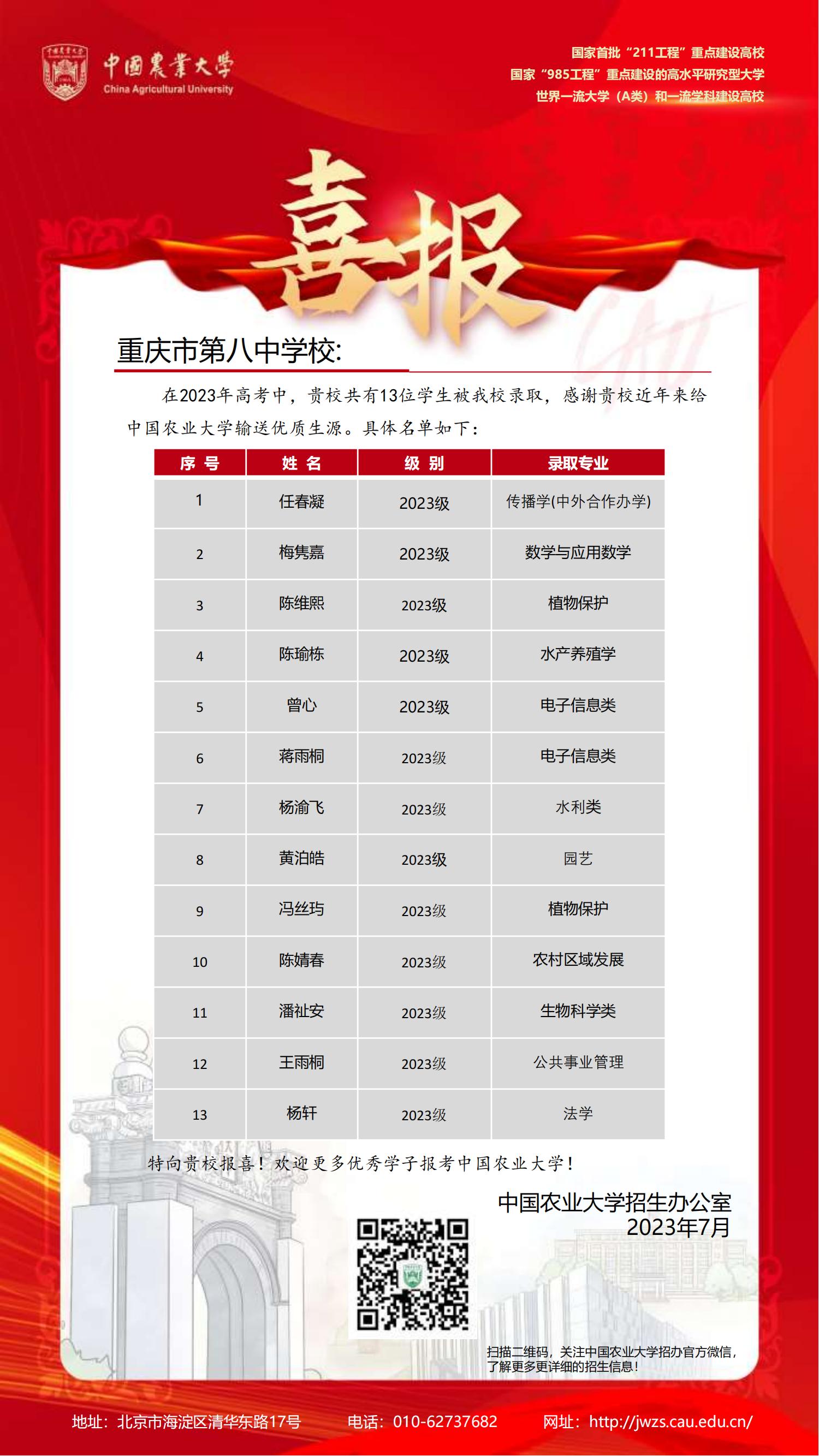向我校发来喜报,恭喜我校高2023级13位优秀毕业学子被中国农业大学录取。