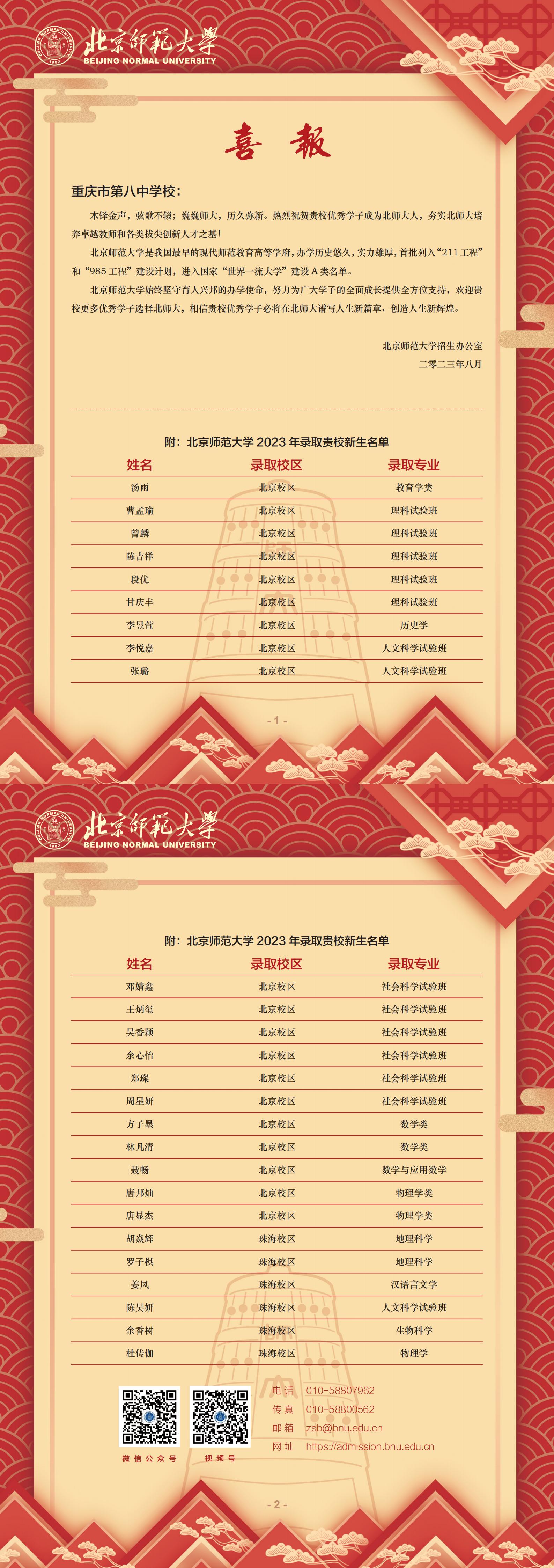 向我校发来喜报,恭喜我校高2023级26位优秀毕业学子被北京师范大学大学录取。
