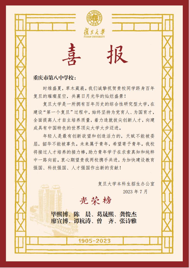 向我校发来喜报,恭喜我校高2023级8位优秀毕业学子被复旦大学录取。