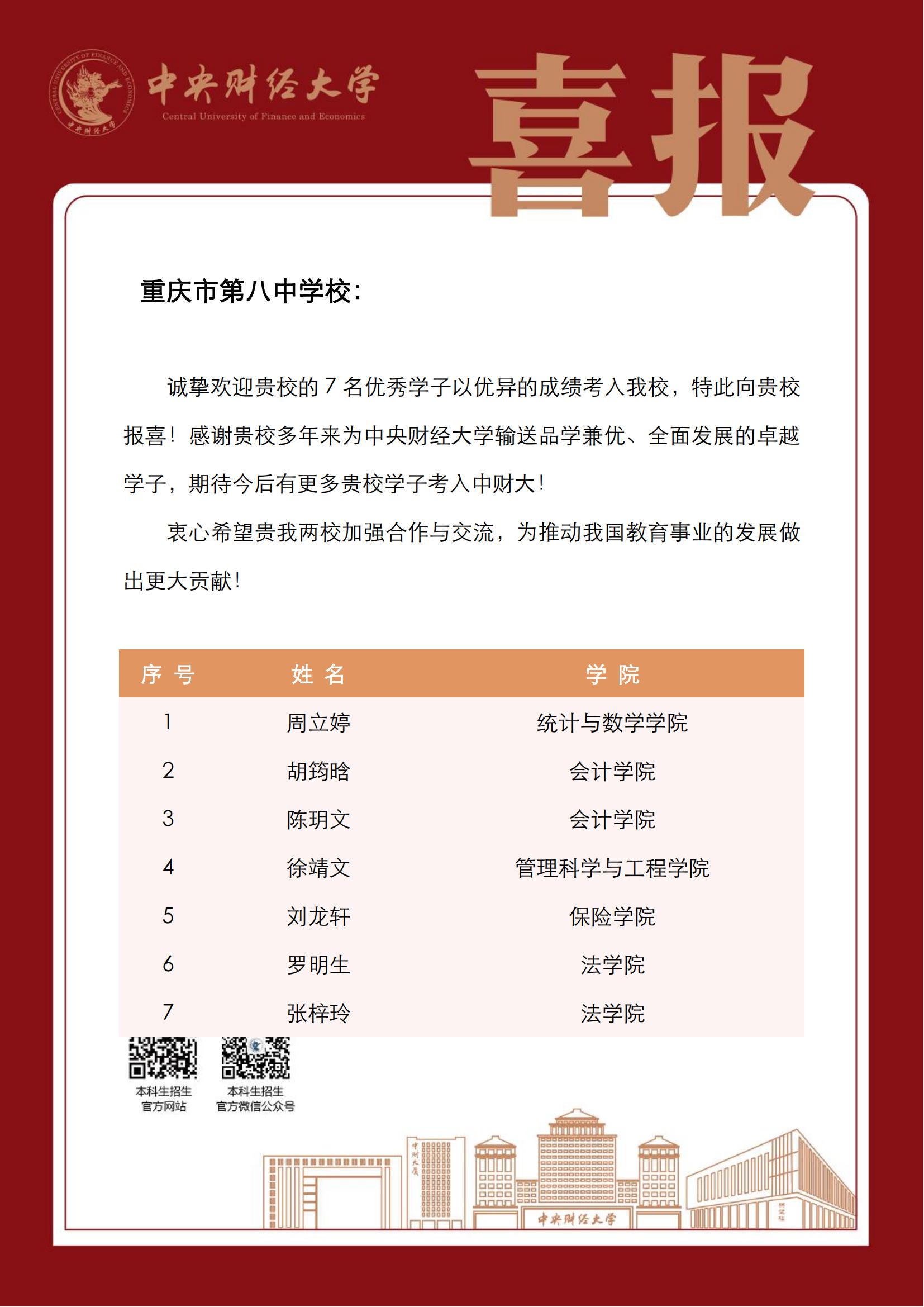 中央财经大学向我校发来喜报,恭喜我校高2023级7位优秀毕业学子被中央财经大学录取。