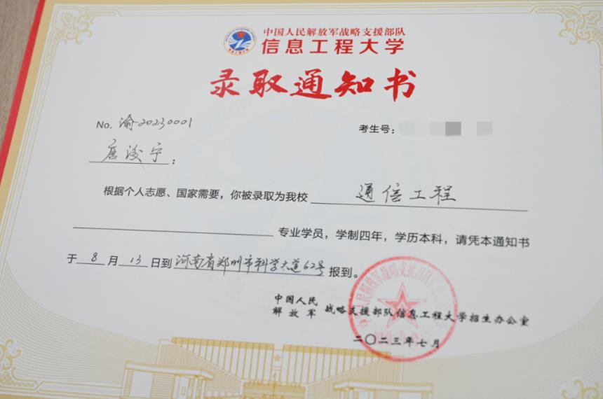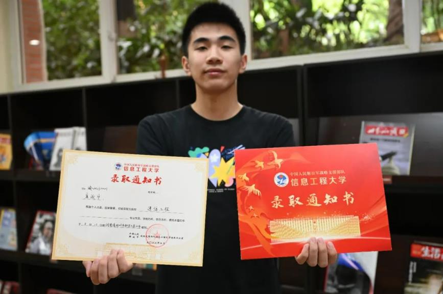 唐浚宁以普通类(物理)624分的成绩,被中国人民解放军战略支援部队信息工程大学录取。“非常开心,没想到今年第一份通知书竟然是自己。”收到通知书的唐浚宁难掩兴奋:“家里有长辈也是军人,我从小也立志成为一名军人,而今愿望实现了,我一定会继续努力,为科技强军奉献力量。”