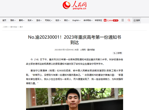人民网——No.渝20230001!2023年重庆高考第一份通知书到达