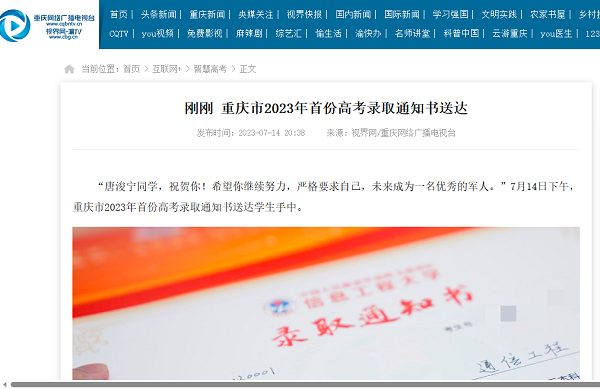 视界网——刚刚 重庆市2023年首份高考录取通知书送达