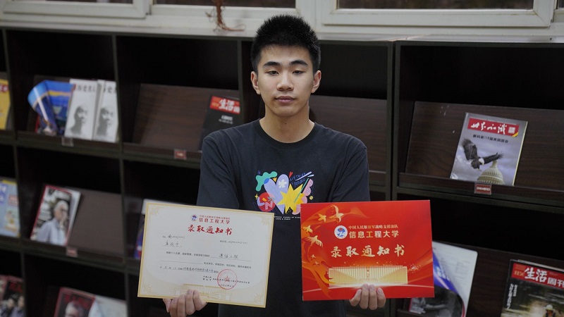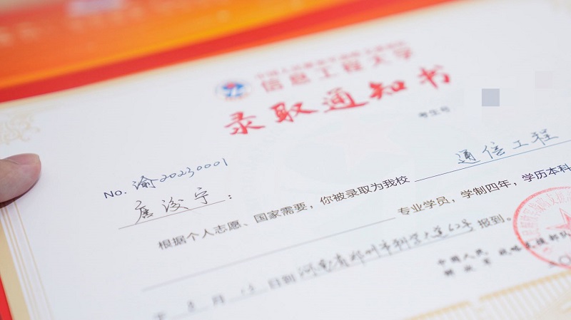 收到这份编号为“No.渝20230001”录取通知书的是重庆八中毕业生唐浚宁,他被中国人民解放军战略支援部队信息工程大学“通信工程”专业录取。