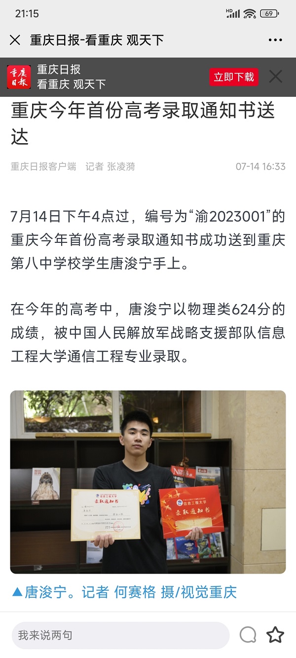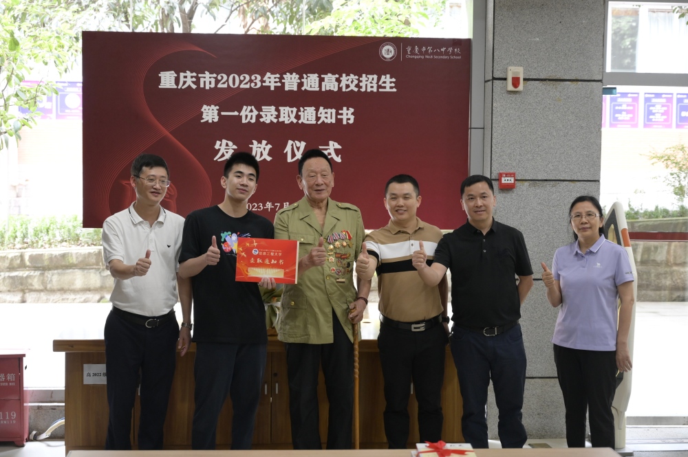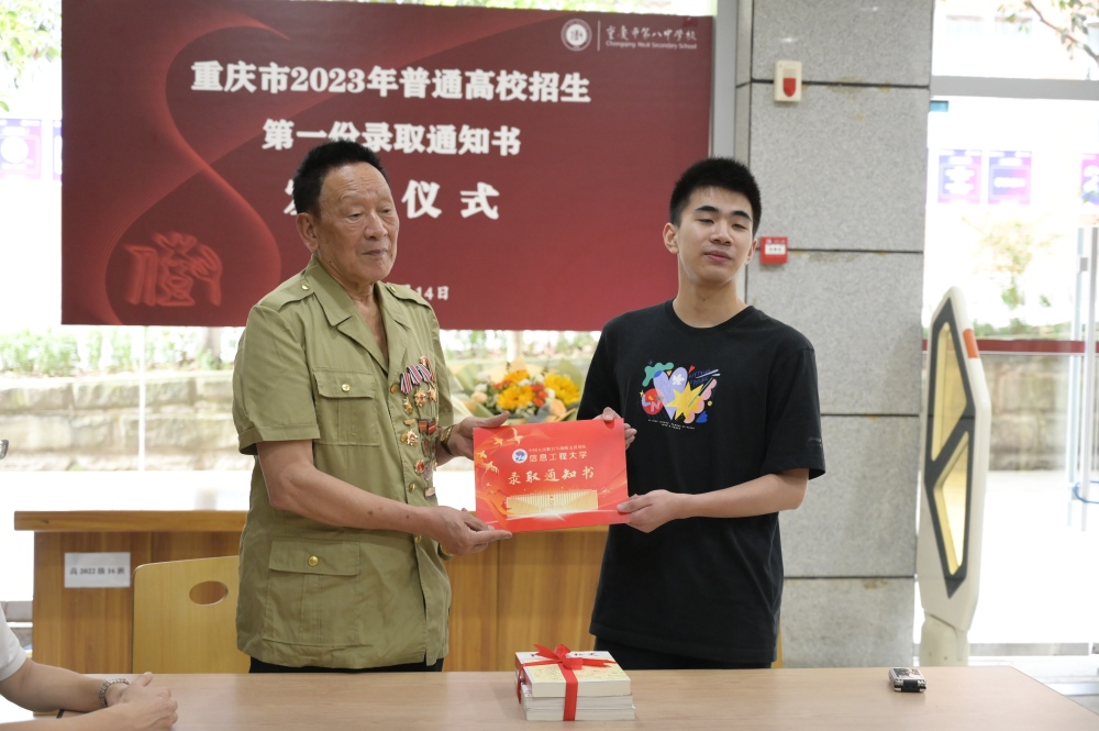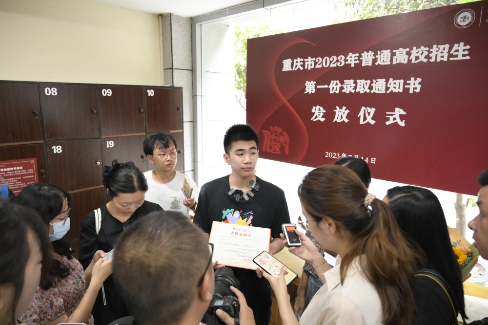 7月14日下午4点过,编号为“渝2023001”的重庆今年首份高考录取通知书成功送到重庆第八中学校学生唐浚宁手上。