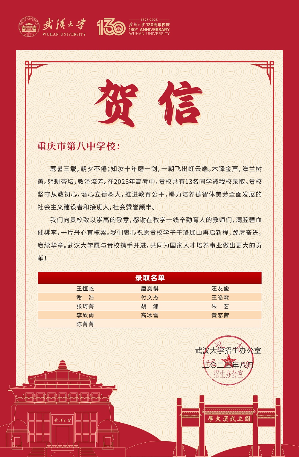 武汉大学向我校发来喜报,恭喜我校高2023级13位优秀毕业学子被