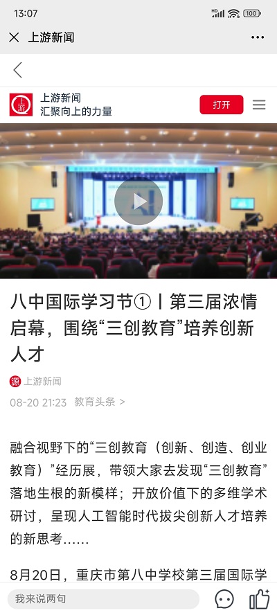 “三创教育”是什么?“三创教育”即ICEE,“I”为Innovation创新、“C”为Creativity创造、“E”为Entrepreneurship创业、“E”为Education教育。旨在培养孩子们的创新意识——看世界的眼光和视角;创造能力——将所学真正所用的能力;创业素养——找到自己的位置,为更多人创造价值的能力。重庆八中的国际学习节已经连续成功举办三届。