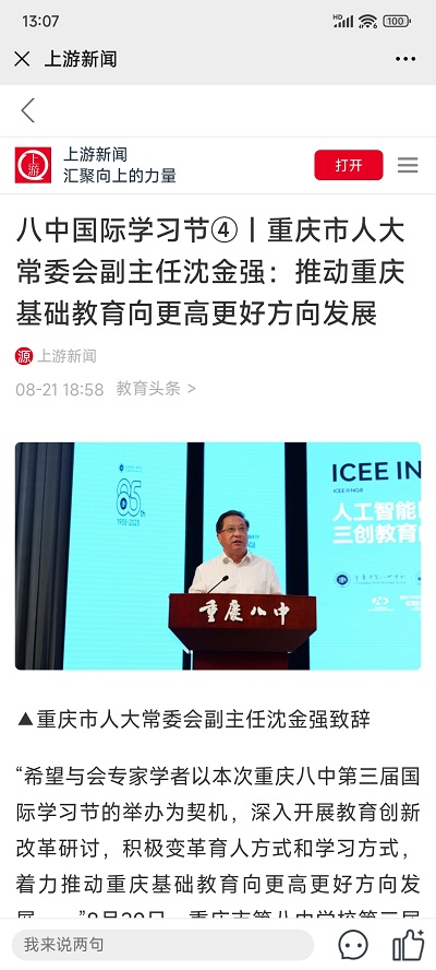 “希望与会专家学者以本次重庆八中第三届国际学习节的举办为契机,深入开展教育创新改革研讨,积极变革育人方式和学习方式,着力推动重庆基础教育向更高更好方向发展……”8月20日,新利体育登录入口官网 第三届国际学习节启幕,国内外多位专家学者齐聚,共同探讨新时代教育发展新方向。重庆市人大常委会副主任沈金强发表致辞。