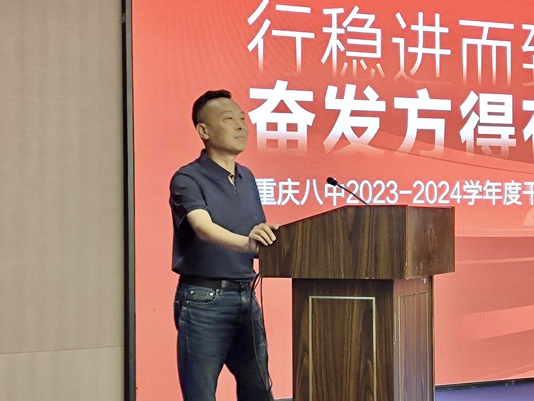 王怒涛副书记围绕安全稳定、校庆宣传作出工作部署,安全方面强调做好安全教育范围、安全教育内容以及智慧校园监控的全覆盖,强调各部门要做好85周年校庆活动协同,抓好系列展示活动。付英副校长作《以“五育融合”推进基础教育高质量发展》的主题发言,着重介绍了“五育融合”的定义、校本化探索的实践困境和五育融合校本化实施的三重视角,此外还介绍了分管艺术、国际工作、三创教育的板块工作动态。张泽勇副校长立足“提升教学领导力”,介绍了教学领导力的内涵,提出了本学期教研板块的工作思路——以课程改革为抓手,以强师固本为重心,优化育人方式,高质量培育英才。梅家烨副校长展示了近年来我校在高考领域取得的辉煌成绩,总结了教学工作面临的新形势、新学年教学工作重点、教务开学准备工作等,勉励广大干部在辉煌中再创辉煌。曾奇副校长围绕“服务育人再提质,八科发展谋新篇”介绍了后勤服务的学年工作计划以及八中科学城中学保师资建设稳定,促文化和美术特长发展、推新老校区建设的谋划。周敦鸾副校长分享了自己关于家校共育的思考,他提出家校共育能够培养学生的广度、厚度、长度,家校间要形成理念共识、生态共创、权责共担。