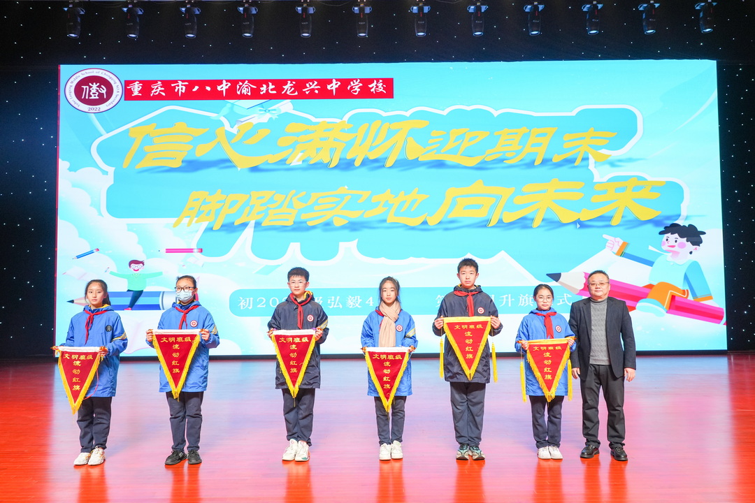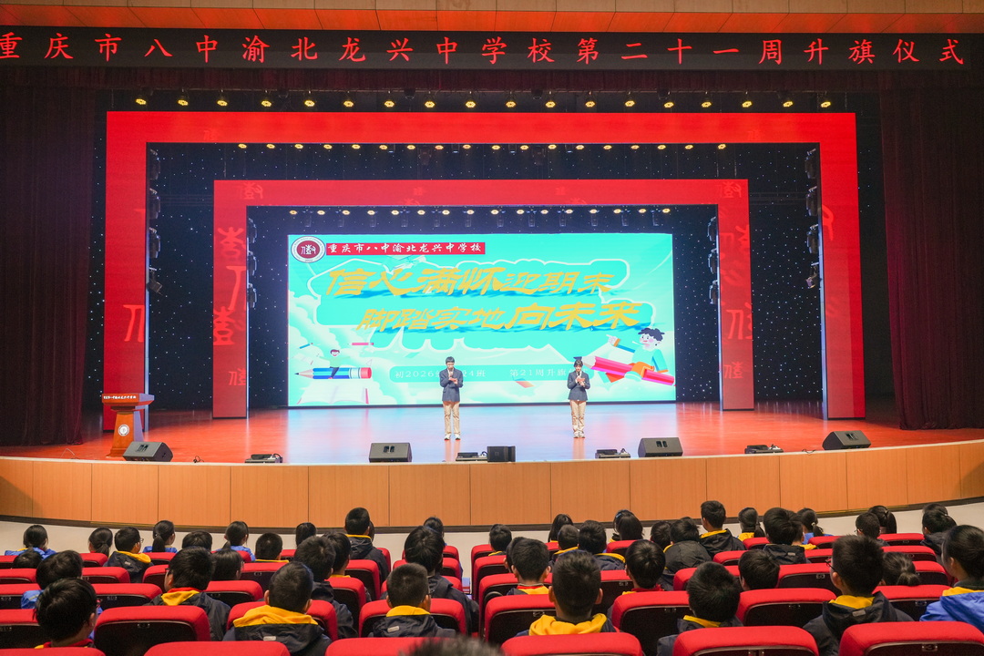 本次升旗仪式以“信心满怀迎期末,脚踏实地向未来”为主题,王宜老师给同学们讲解了应考技巧、初2026级4班赵梦涵同学进行国旗下演讲,初2026级4班张皓轩、郑茗予主持仪式。