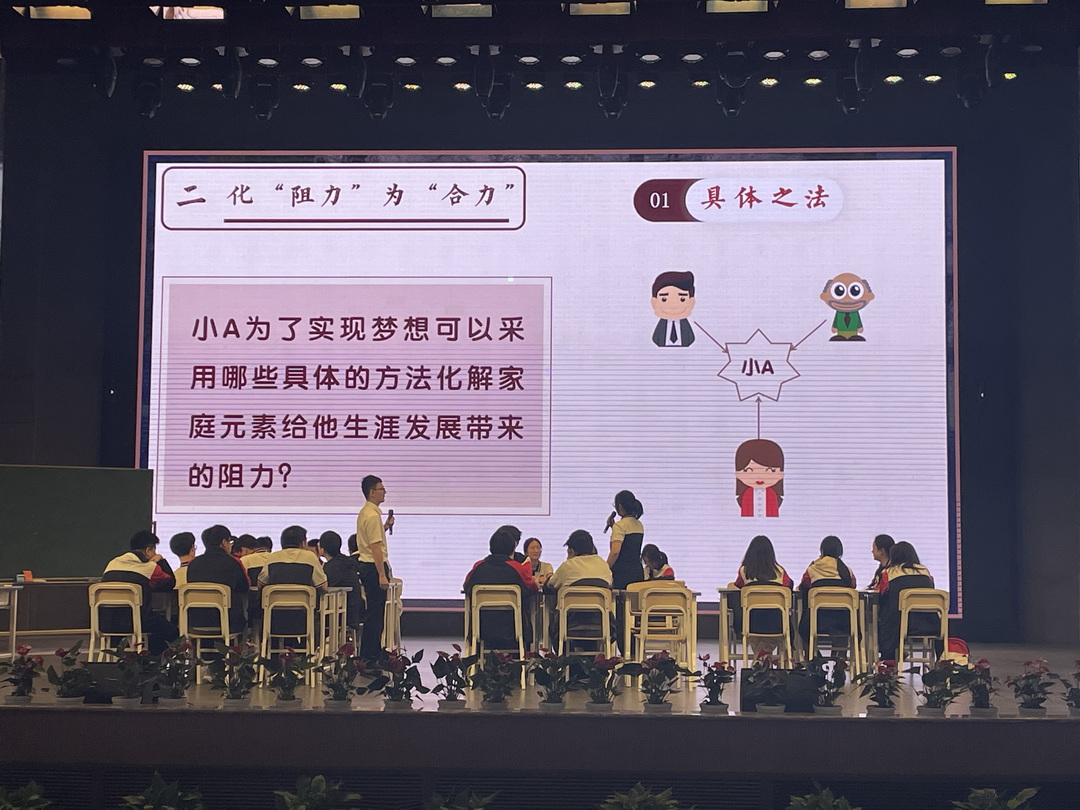 比赛中,刘念老师围绕“家庭与生涯”这一生涯规划核心话题展开,以生涯规划办公室中的小A的故事这一真实情景为讨论核心,启发学生用辩证的思想探究小A所遇见的困境。在与学生的交谈与讨论中,师生共同发现,同学们所认为的与自己想法不合的“阻力”的背后,是家人出于爱的建议,是爱的烦恼,所以我们不能一味抗拒家庭、排斥家庭,应当理性交流;同学们可以挖掘家庭美好元素,为自己生涯赋能,在所有美好元素中,最重要的是家庭对于个人的精神引领。在调和家庭因素的过程中,一个人的未来发展力将得到提升,不仅能反哺家庭,亦能助力祖国腾飞!