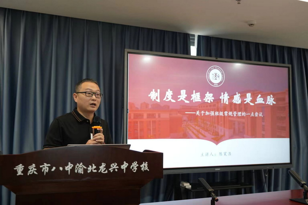 会议特别安排了两位专家作精品教学经验分享。初二年级组长、数学备课组长周攀老师分享的主题是保底色、增亮色。周老师从14年的教学经历和成果分享激励青年老师们坚持奋斗,持续学习。初一年级组长陈宽浩老师则围绕“制度是框架,情感是血脉”展开分享,主要讲述了加强班级管理的方法。他指出思想引领是前提,生活常规是保障,学习常规是关键,坚持贯彻是根本。通过幽默的话语,给出了具体可操作的方法,大到年级的管理,小到各学科课代表职责的分配,让老师们受益匪浅。