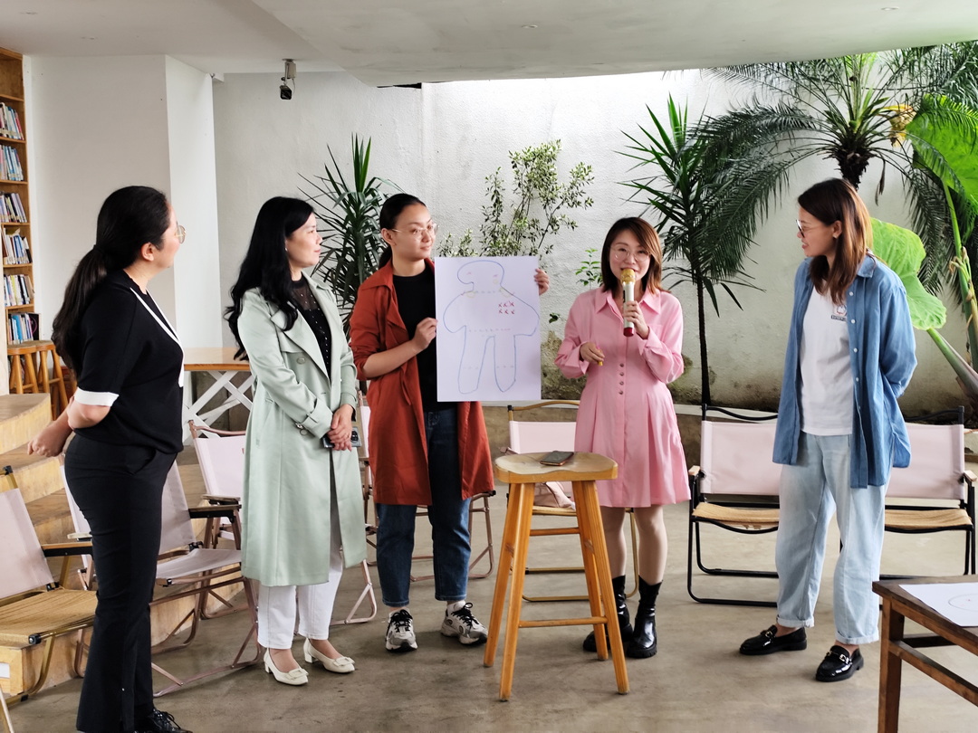 张婷教授将老师们分为七个小组,为每个小组的老师分发了画纸与蜡笔,请每个小组在画纸上画出一个“小人”,接下来的活动全部围绕这个“小人”展开。首先,在每组自行绘制的小人身上用自己喜欢的颜色形象地标注出工作这么多年来自己身体不舒服的地方,通过直面自己的不适,将内心的压力外化。按照小组顺序,每个小组的代表依次分享本组老师不适之处,比如肩颈病痛、腰椎间盘突出、发际线上移等。然后,张婷教授引导老师们用蜡笔给小人一些安慰、支持、帮助,在帮助小人的过程中,老师们在画纸上绘制了自己内心的渴望,比如多一点由自己支配的时间,去旅游,去听音乐会;多一点休息的时间,缓解身心的疲惫;多一点物质保障,提升自己生活质量等。班主任老师们真诚地发言感动了彼此,这是一场真心交流的盛会。
