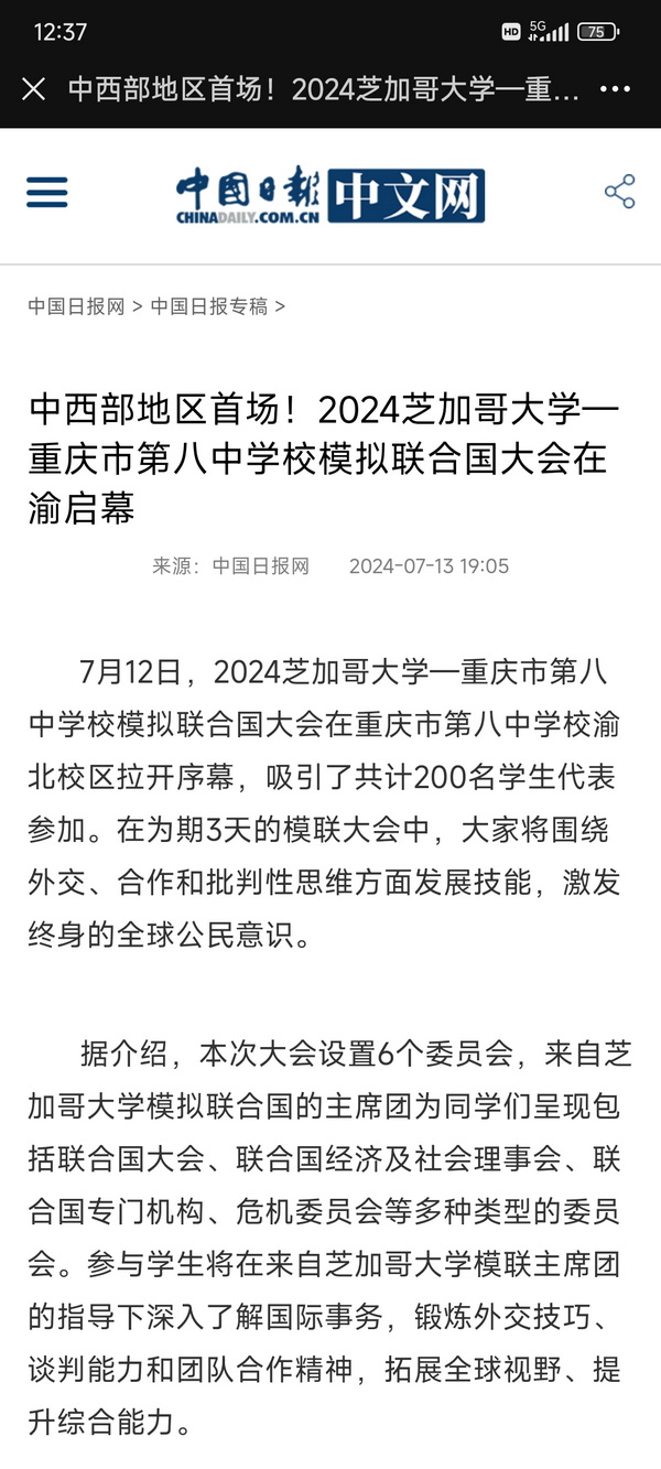 重庆八中学生代表表示,通过这次模拟联合国大会,我们不仅学到更多关于国际事务的知识,更能切实感受到个人在推动全球发展中的力量和责任,将以开放的心态聆听他国代表的观点,以宽容和智慧化解分歧,共同为构建一个更加和平、繁荣、公正的世界贡献自己的力量。