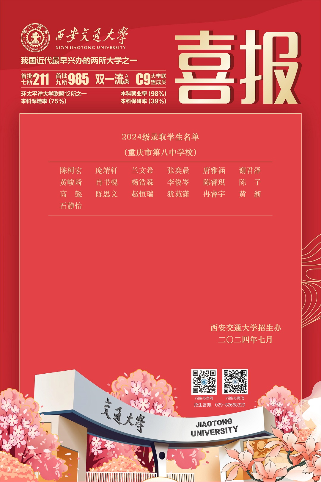 西安交通大学发来喜报,祝贺我校19位同学以优异成绩考入