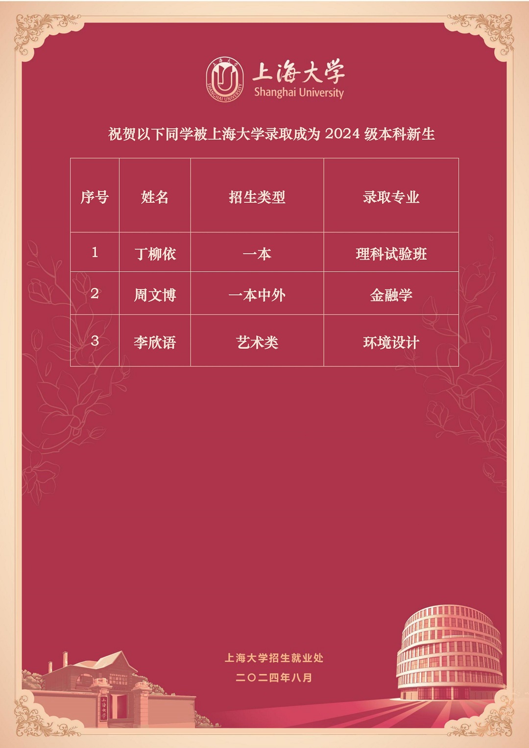 ,祝贺我校3位同学以优异成绩考入上海大学
