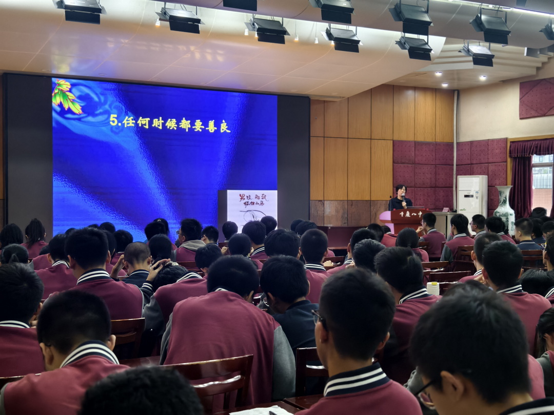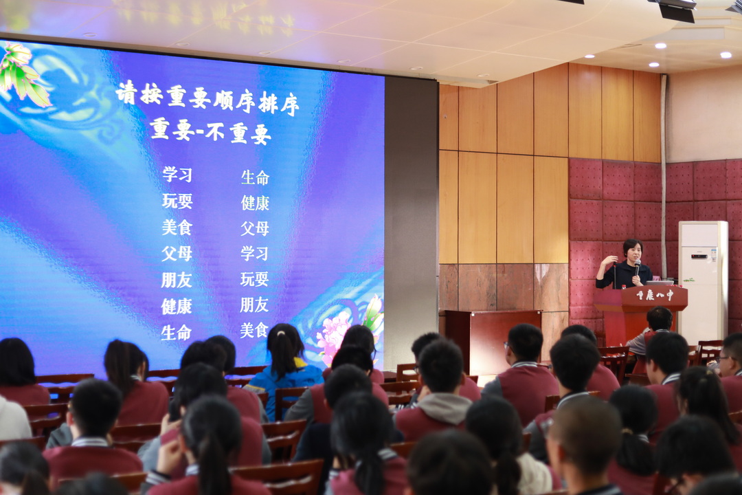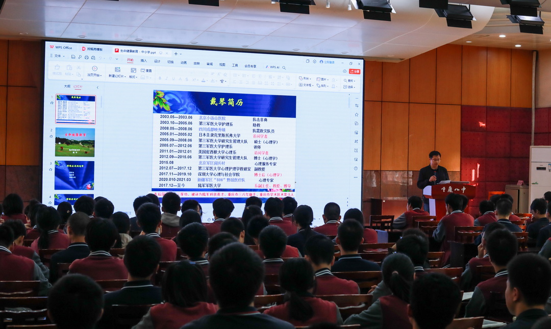 为进一步促进学生身心发展,培养学生积极心态,营造健康向上的校园氛围,11月14日下午,陆军军医大学戴琴教授受邀于科技楼报告厅为高2026级学子作“珍爱生命”主题心理健康讲座。重庆八中教务处副主任、重庆八中沙坪坝校区高2026级年级副组长谢凯老师主持本次讲座。