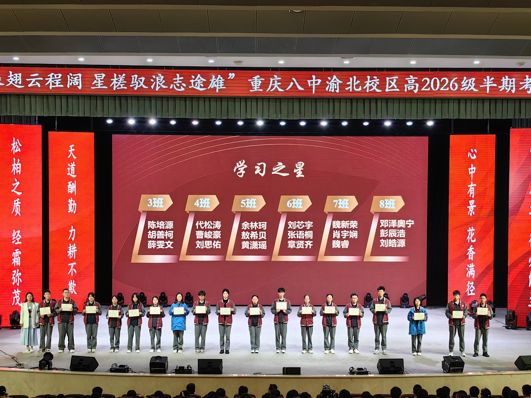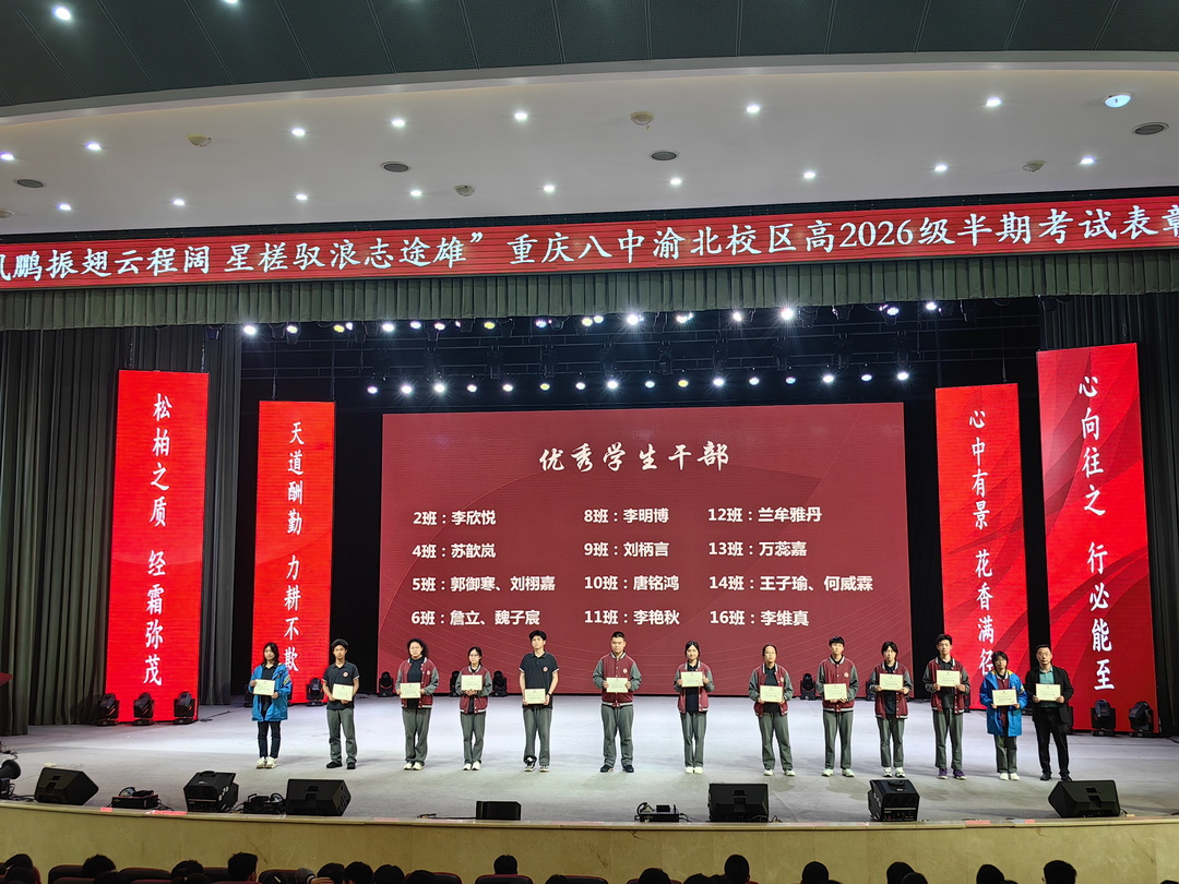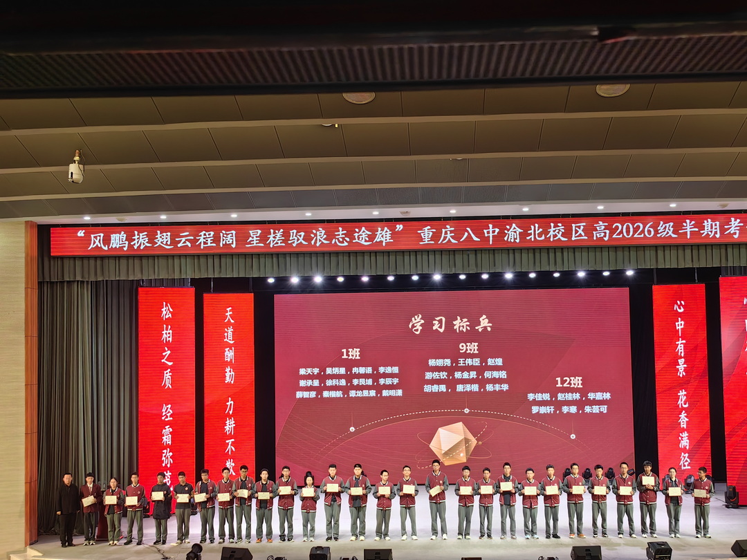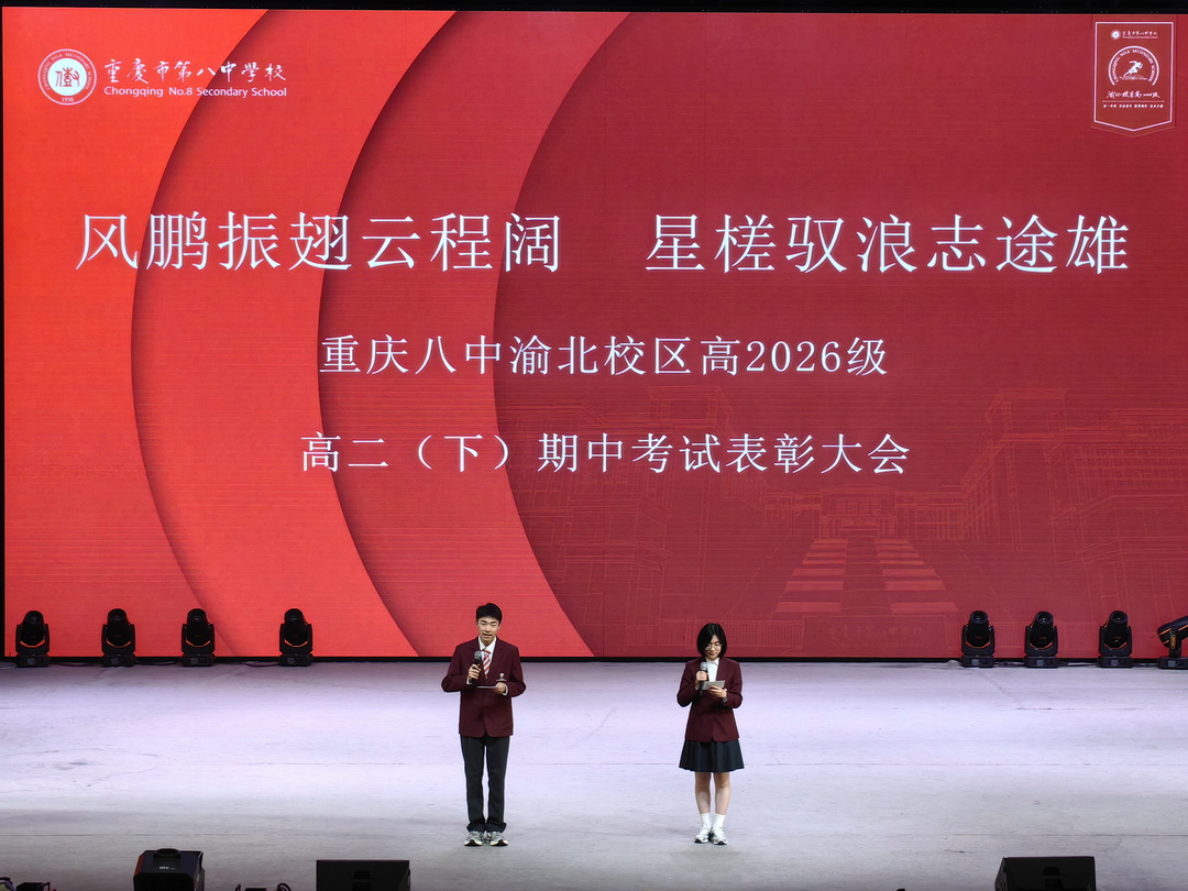 2025年4月29日晚6点30分,重庆八中渝北校区高2026级全体师生在大礼堂举行了主题为"风鹏振翅云程阔,星槎驭浪志途雄"的半期表彰大会。高二1班吴炳星和2班李欣悦两位同学主持会议。这场星光熠熠的盛典,既是荣耀的加冕礼,更是新征程的誓师会。