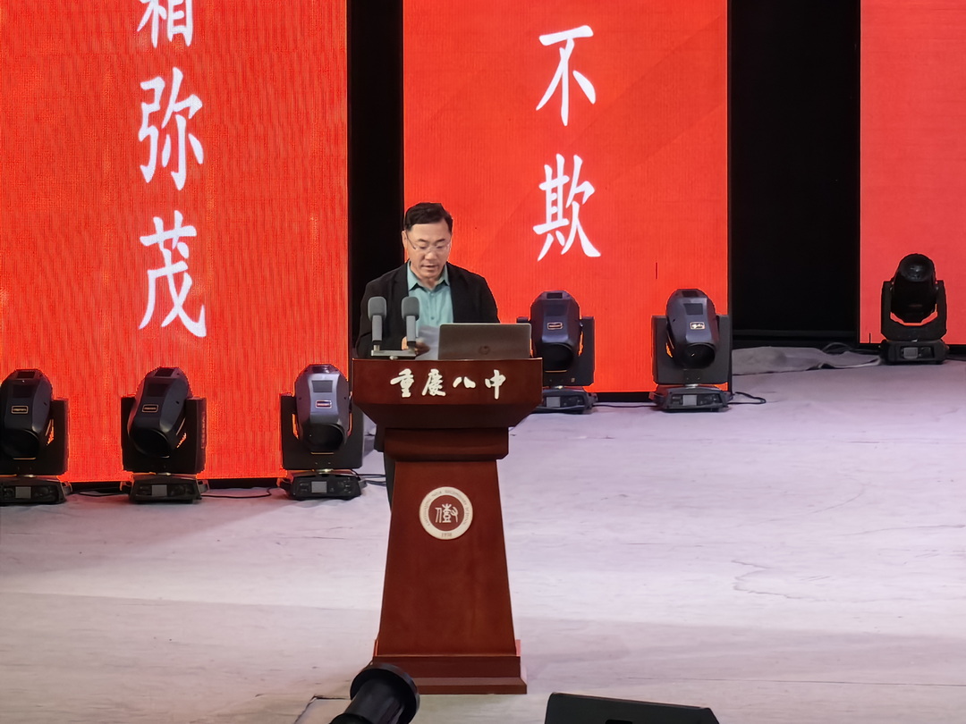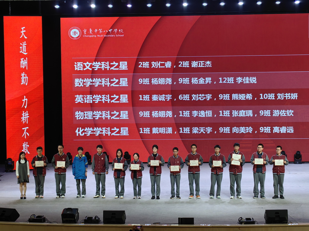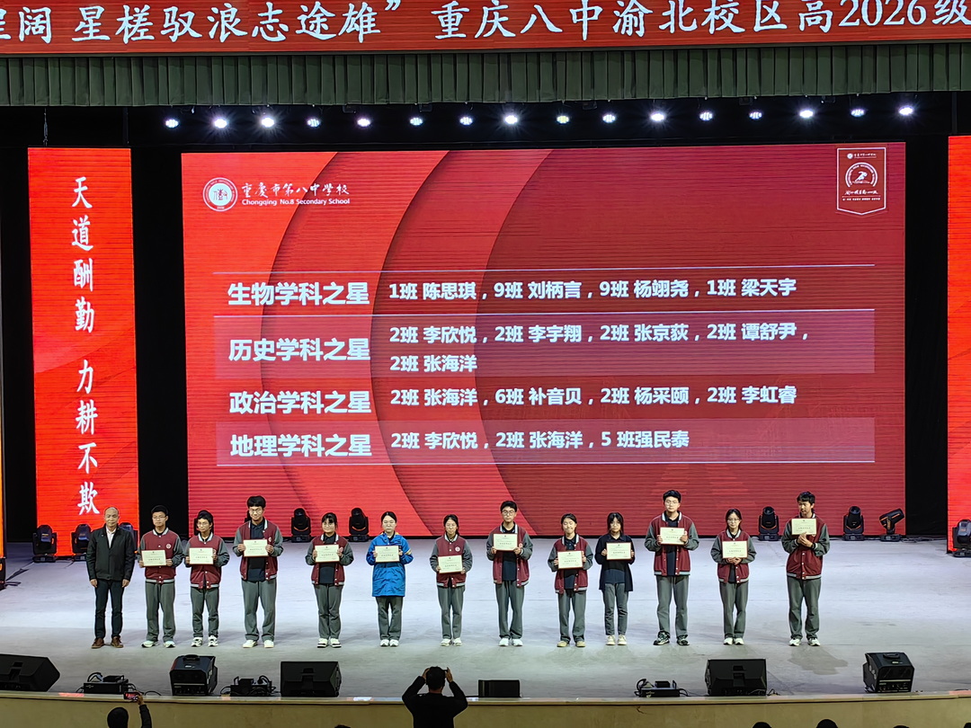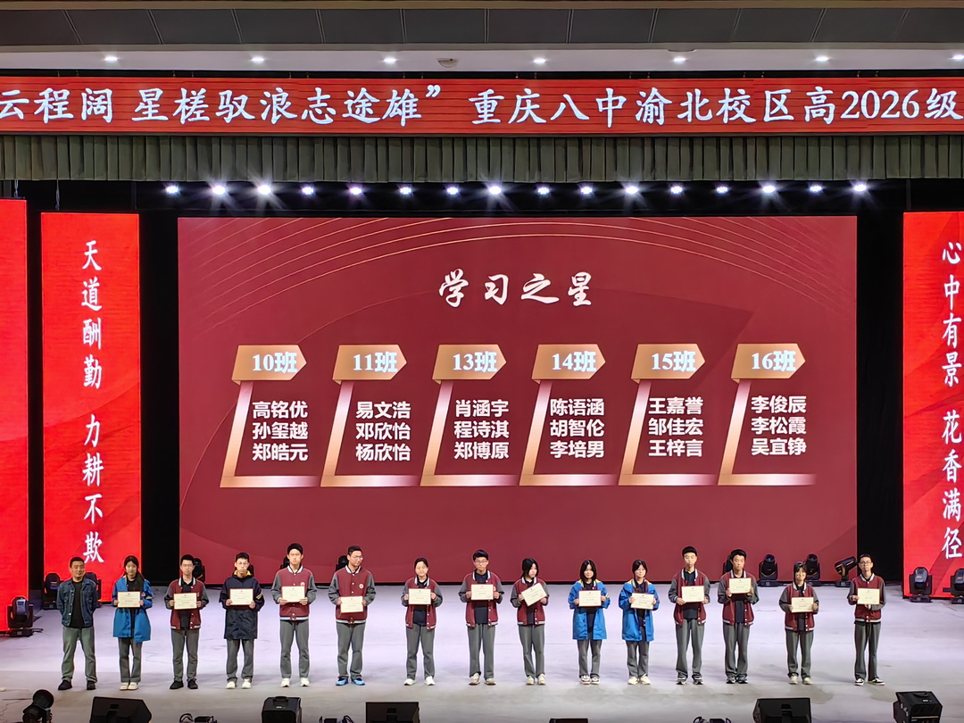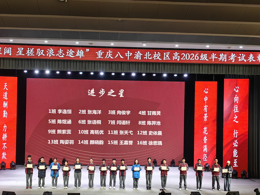 2025年4月29日晚6点30分,重庆八中渝北校区高2026级全体师生在大礼堂举行了主题为"风鹏振翅云程阔,星槎驭浪志途雄"的半期表彰大会。高二1班吴炳星和2班李欣悦两位同学主持会议。这场星光熠熠的盛典,既是荣耀的加冕礼,更是新征程的誓师会。