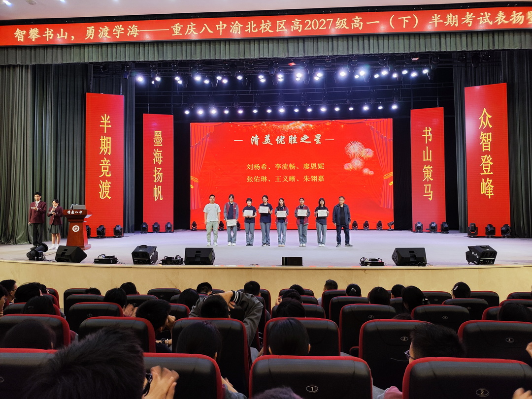 为表扬先进,充分发挥模范带头作用,营造浓厚的学习氛围,进一步调动全体学生学习的主动性和积极性,5月6日晚上,重庆八中渝北校区高2027级在学校大礼堂举行了半期考试表扬暨总结大会。本次大会对表现优异的个人和班级进行表彰,并围绕高效学习方法和习惯养成展开经验分享。年级主任张诗文、各班班主任及全体高一学生参加。