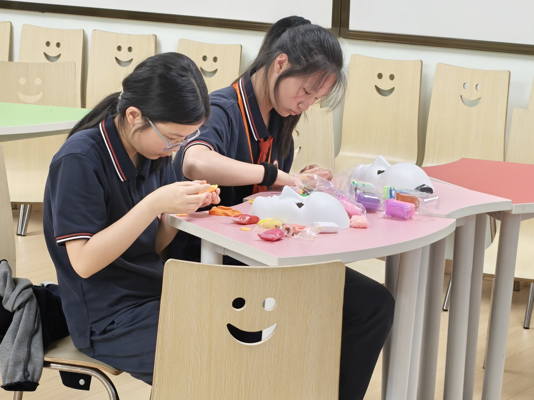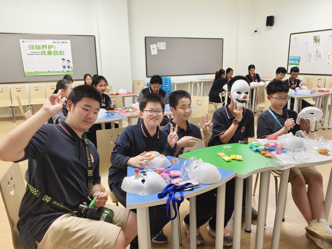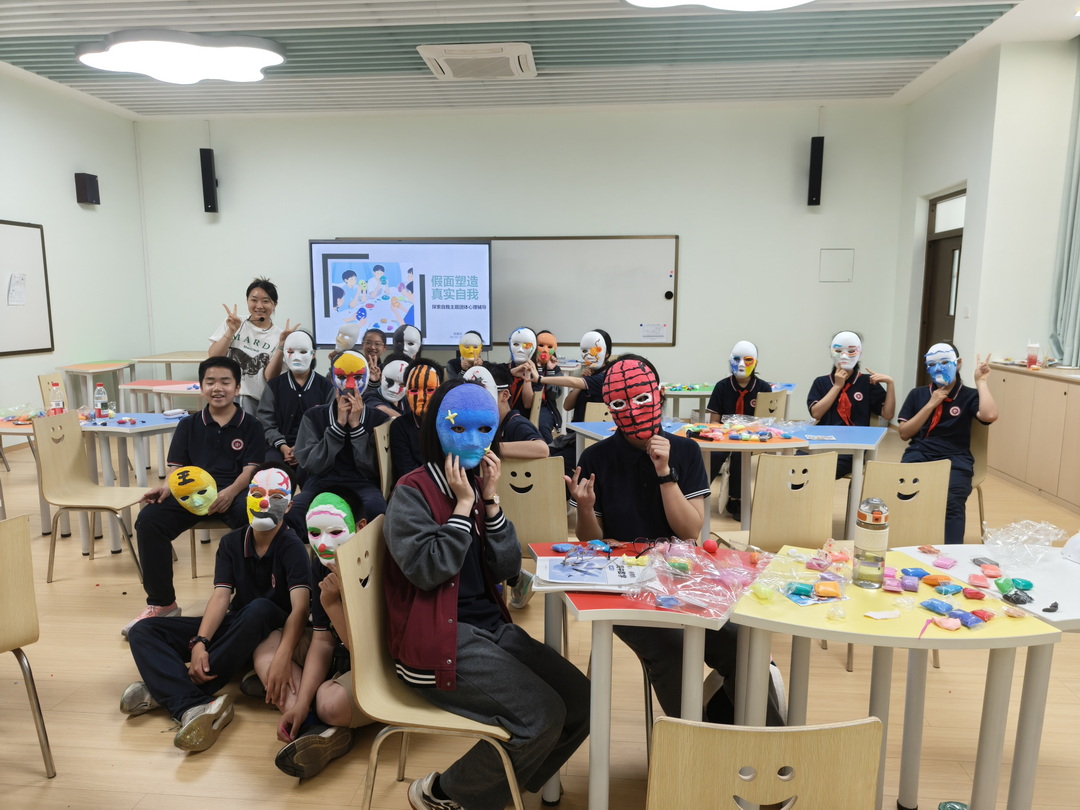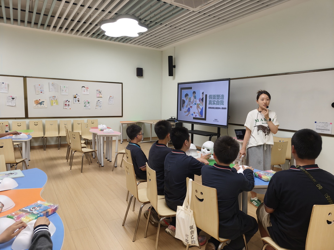 在面具创作环节,学生用色彩和线条自由表达内心情绪,抛开“完美”束缚:深蓝涂抹压力、明黄勾勒向往、色块组合展现矛盾……20 分钟内,承载真实情感的面具成为内心“可视化”载体。