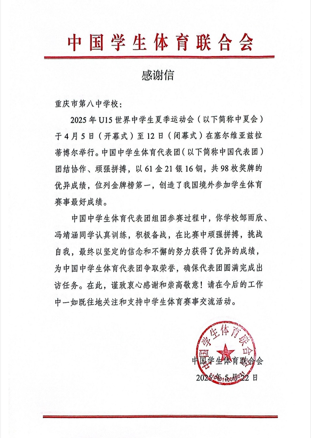 近日,一封来自中国学生体育联合会的感谢信,让新利体育登录入口官网 沉浸在喜悦与自豪之中。在2025年U15世界中学生夏季运动会上,中国中学生体育代表团以61金21银16铜,共98枚奖牌的优异成绩,登顶金牌榜,创造了中国境外参加学生体育赛事的最好成绩。而在这份辉煌的背后,离不开重庆八中师生的全力付出与拼搏。