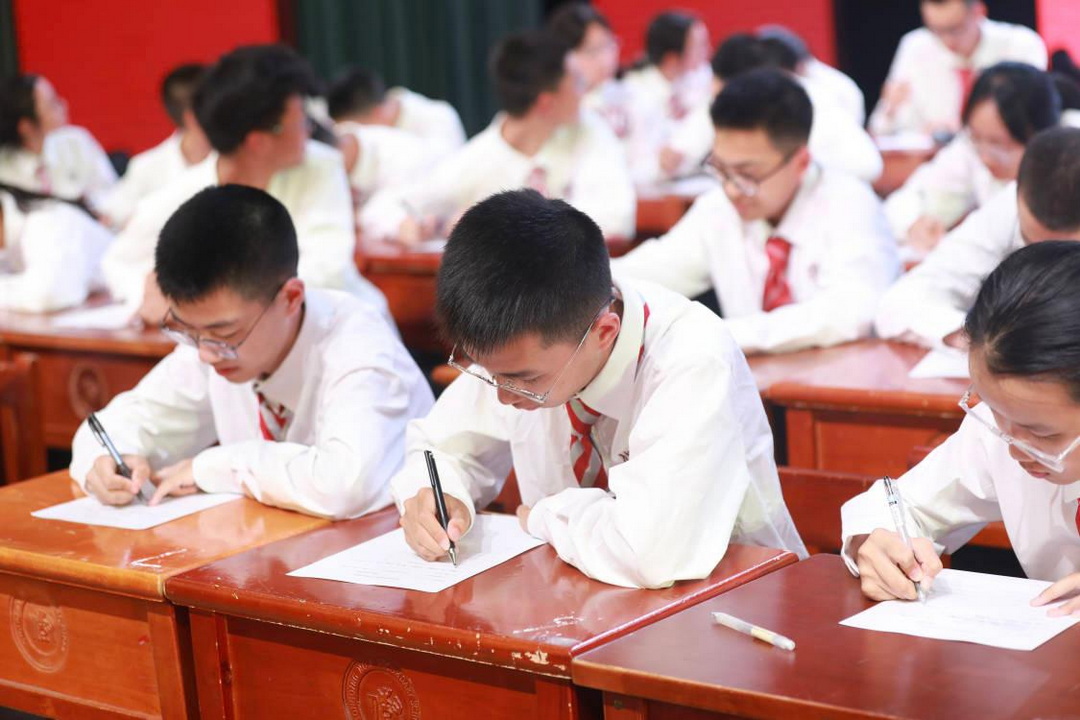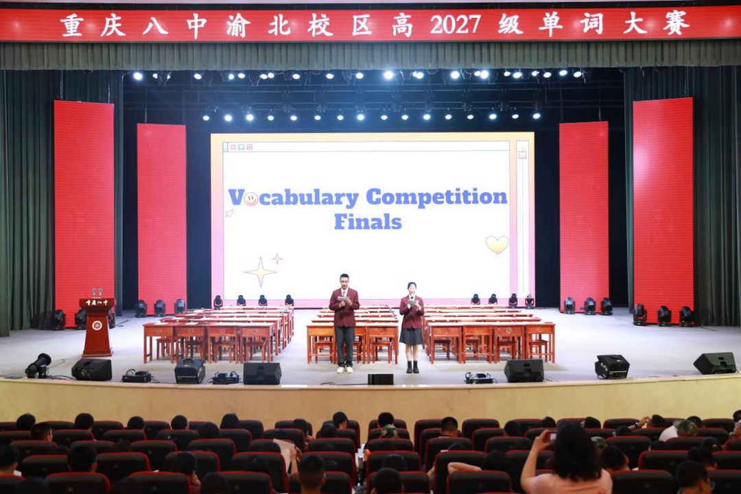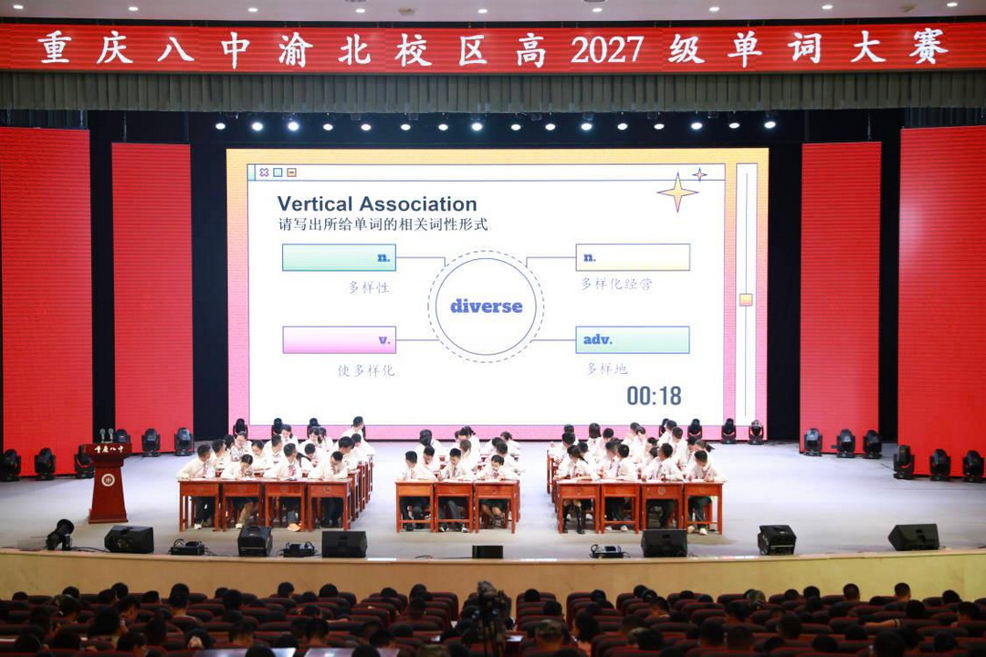 2025年5月28日晚,重庆八中渝北校区高2027级高一的同学们迎来了一场精彩纷呈的单词比赛决赛。比赛在学校大礼堂举行,吸引了53名优秀选手参赛,现场气氛热烈,充满了知识的较量与智慧的碰撞。