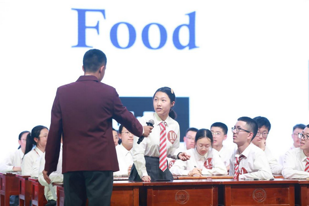 台上的选手们个个全神贯注、沉着应对,他们时而紧锁眉头思考,时而快速书写答案,展现出高一学子对英语学习的热情与专注。值得一提的是,台下的学生观众们也并非只是旁观者,他们手持与台上选手相同的题目资料,积极与主持人互动,踊跃参与答题。每当主持人抛出问题,台下观众都会迅速思考并举手抢答,现场气氛热烈,不时爆发出阵阵掌声与欢呼声,将比赛氛围推向一个又一个高潮。这种台上台下的互动不仅增加了比赛的趣味性,也营造了浓厚的学习氛围,让每一位参与者都沉浸其中。