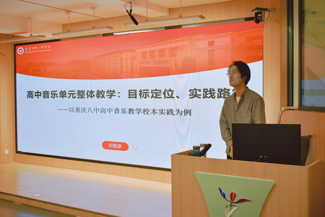 重庆八中音乐教研组长邓君彦老师以《高中音乐单元整体教学:目标定位、实践路径》为主题展开讲座。邓老师从高中音乐单元整体教学的本体意蕴、目标定位、实践路径三个维度进行深入探讨。本研究界定了高中音乐单元整体教学的特点,梳理其百年演进,厘清混淆,特别是对比与大单元教学异同。对其目标定位进行学科学段的精准定位。实践上,以重庆八中高中音乐教学校本实践为例,构建完整教研架构,通过教师分层发展、完善课程体系,开展大课程体系化、小模块项目化,单课时主题式,微环节沉浸式等具体践行模式,促进学生音乐素养提升,实现高效课堂之目标。