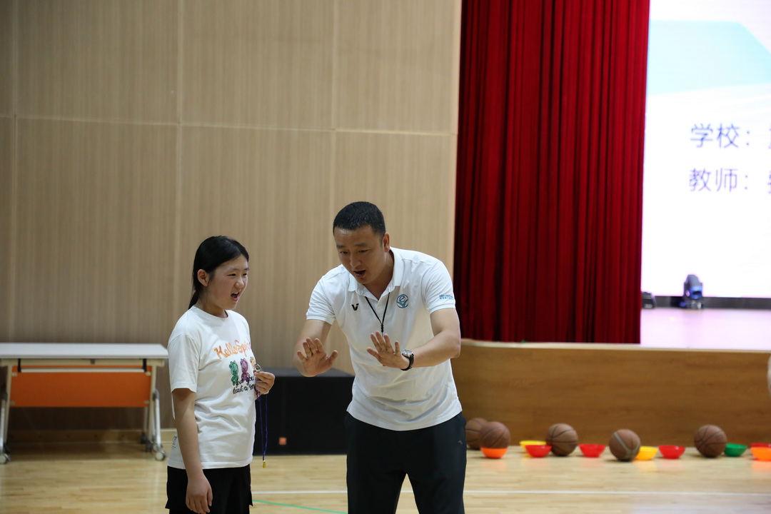 曲靖一中庄启帆老师与重庆八中费东亮老师以同一教学内容展开差异化教学实践。庄启帆老师的课堂以“逐梦奥运”为情境主线,通过观看巴黎奥运会夺冠视频激发学生爱国情怀与体育精神,教学中注重分层练习与技术细节指导,从原地跨步练习到行进间变向运球挑战赛,逐步突破“用身体掩护球”“人与球协调配合”等重难点,全程贯穿“学—练—赛—评”闭环设计,展现出对课堂节奏的精准把控。费东亮老师则以“五赛贯通”为创新模式,通过热身赛、对抗赛、挑战赛、教学赛、强度赛层层递进,将“变向幅度”与“变向时机”的教学重点融入趣味游戏与实战对抗中。课堂中,“数字加减热身游戏”“蚂蚁队伍大搬运”等环节巧妙结合体能训练与战术思维培养,小组积分制与MVP评选机制充分调动学生主动性,体现出“以赛代练”的教学理念与对学生主体地位的深度关注。