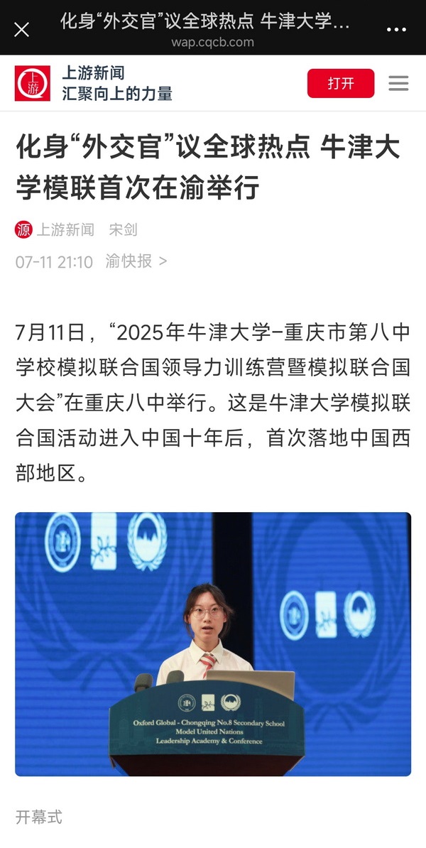2025年2月,重庆八中的47名同学就曾受牛津大学模拟联合国大会邀请,与来自全国各地的100余名青年学子,在牛津大学与全球500余名同龄人同场竞技,交流切磋。