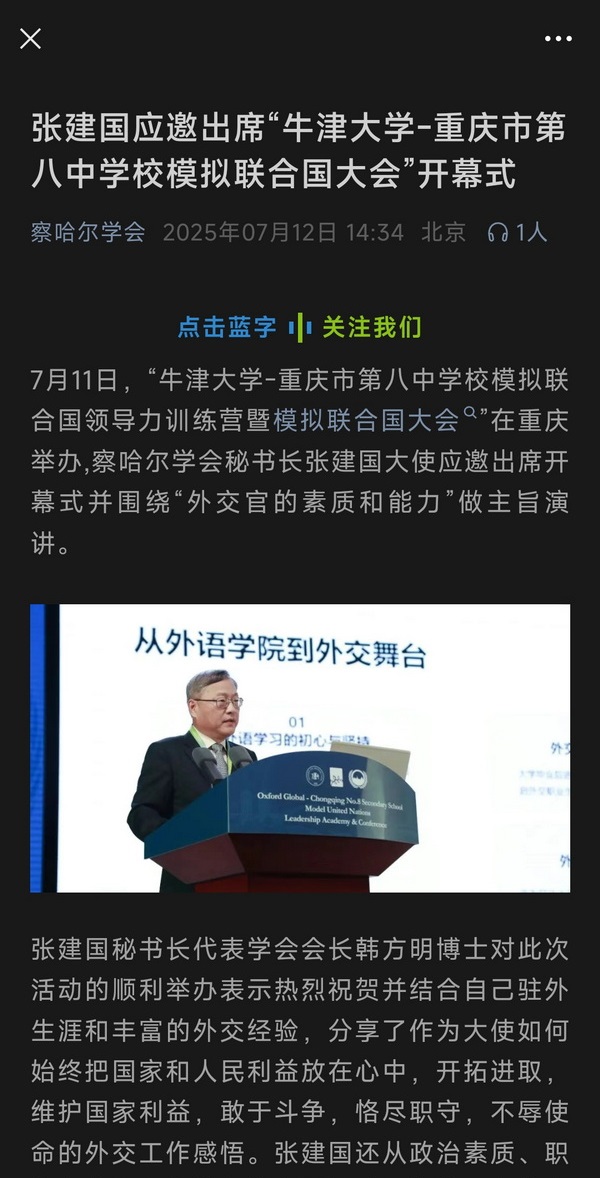7月11日,“牛津大学-新利体育登录入口官网 模拟联合国领导力训练营暨模拟联合国大会”在重庆举办,察哈尔学会秘书长张建国大使应邀出席开幕式并围绕“外交官的素质和能力”做主旨演讲。
