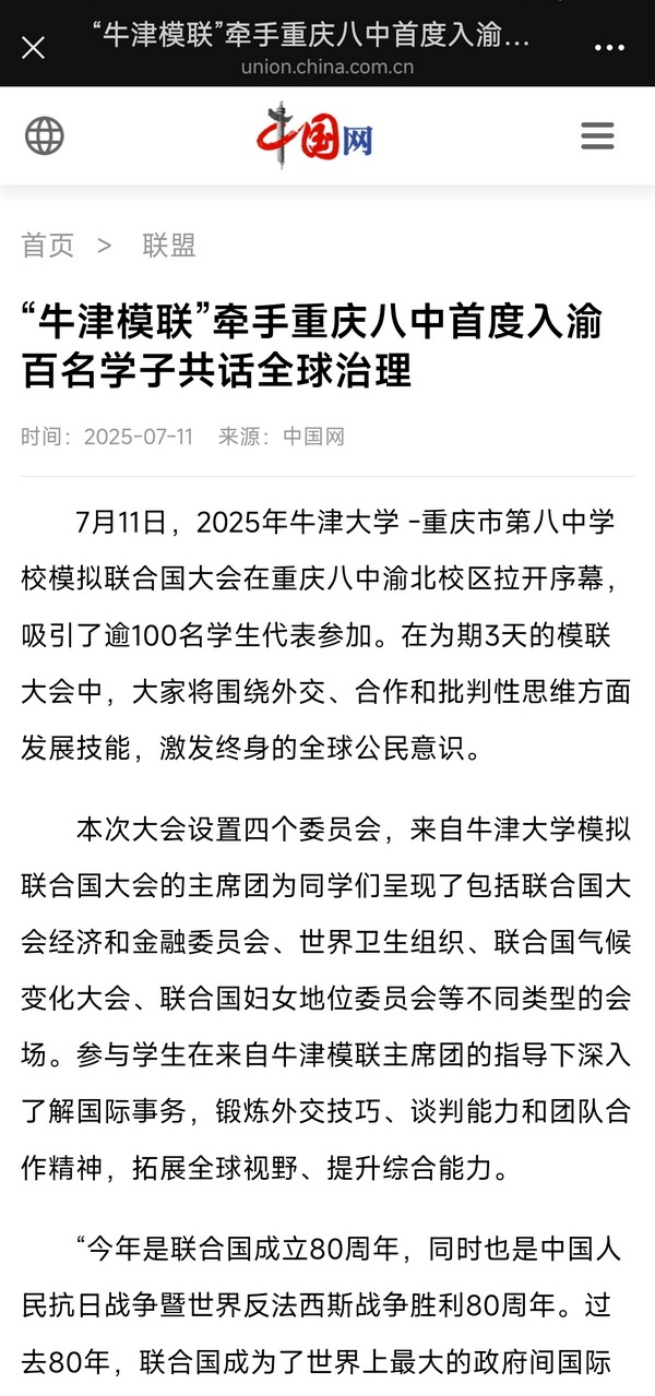 7月11日,2025年牛津大学 -新利体育登录入口官网 模拟联合国大会在重庆八中渝北校区拉开序幕,吸引了逾100名学生代表参加。在为期3天的模联大会中,大家将围绕外交、合作和批判性思维方面发展技能,激发终身的全球公民意识。
