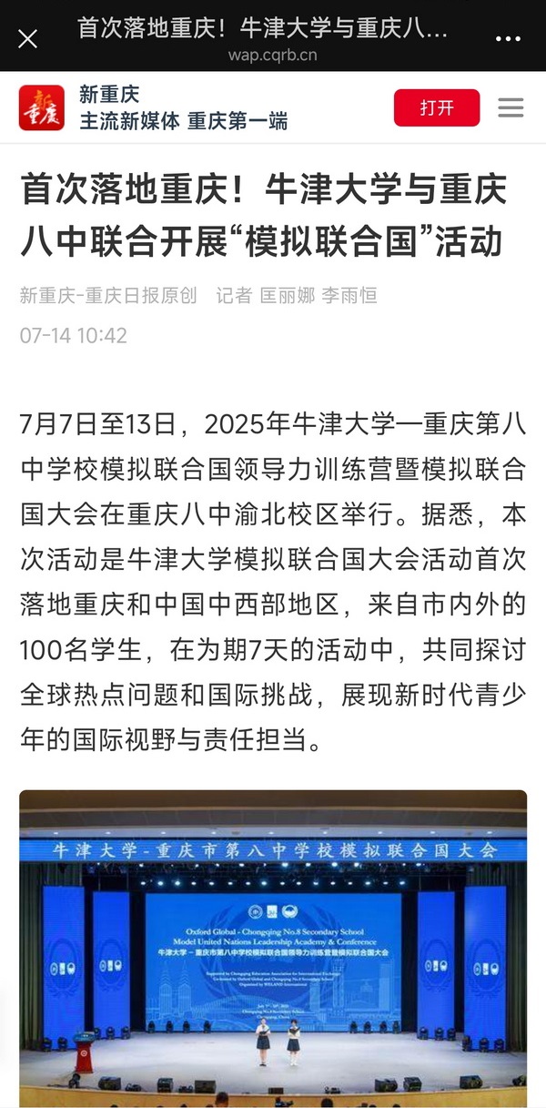 7月7日至13日,2025年牛津大学—重庆第八中学校模拟联合国领导力训练营暨模拟联合国大会在重庆八中渝北校区举行。据悉,本次活动是牛津大学模拟联合国大会活动首次落地重庆和中国中西部地区,来自市内外的100名学生,在为期7天的活动中,共同探讨全球热点问题和国际挑战,展现新时代青少年的国际视野与责任担当。